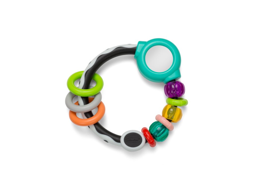 Biztonságos csörgő olyan formában, amely lehetővé teszi a könnyű megfogást a gyermekek kis kezeivel. A mozgatható, színes karikák és gyöngyök, valamint a biztonságos tükör felkeltik a gyermek figyelmét és felfedezésre ösztönzik.