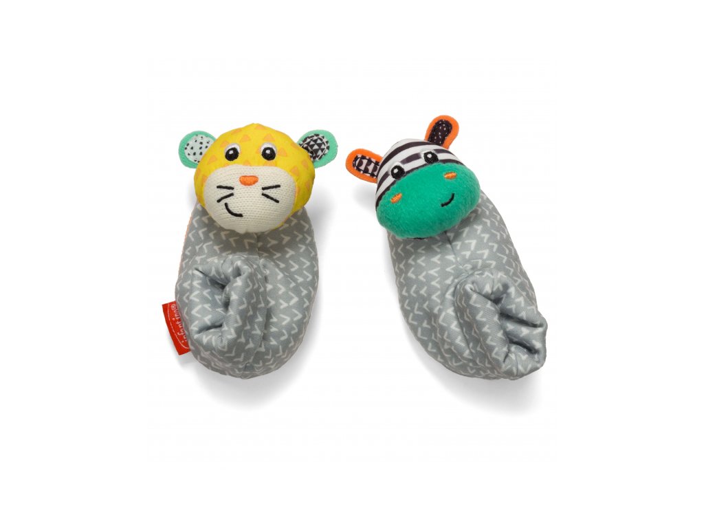 A tigris és a zebra vidám arcával ellátott felhúzható papucsok serkentik a gyermek hallásának, látásának és tapintásának fejlődését. A gyermek a lábával rúgva figyeli és vizsgálja a mozgó, csörgő állatokat.