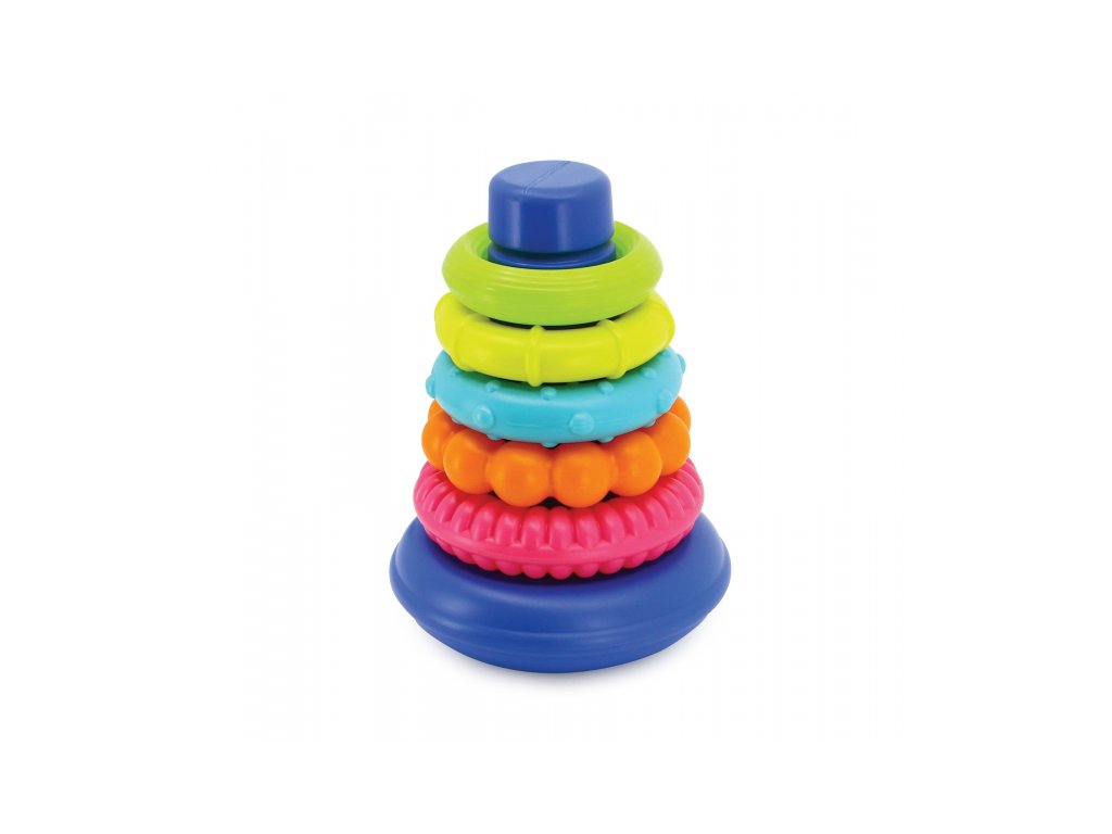 A piramis egy kerek talapzatból és különböző színű, méretű és textúrájú felhelyezhető karikákból áll. A gyermek megpróbálja a gyűrűket a megfelelő sorrendben elhelyezni, és piramist alkotni belőlük. A kerek talapzatnak köszönhetően a játék minden irányba billeg, és a karikák felhelyezése igazi kihívás lesz a gyermek számára!