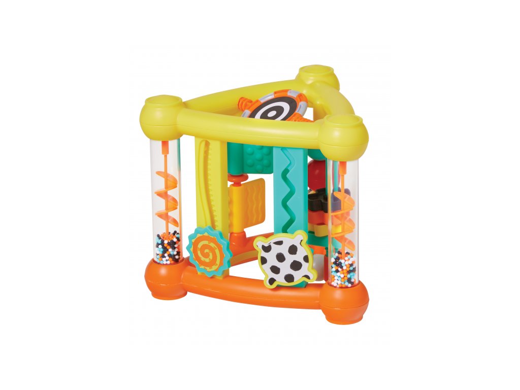 A színes játszópult sokféle felfedezésre váró tevékenységet tartalmaz.