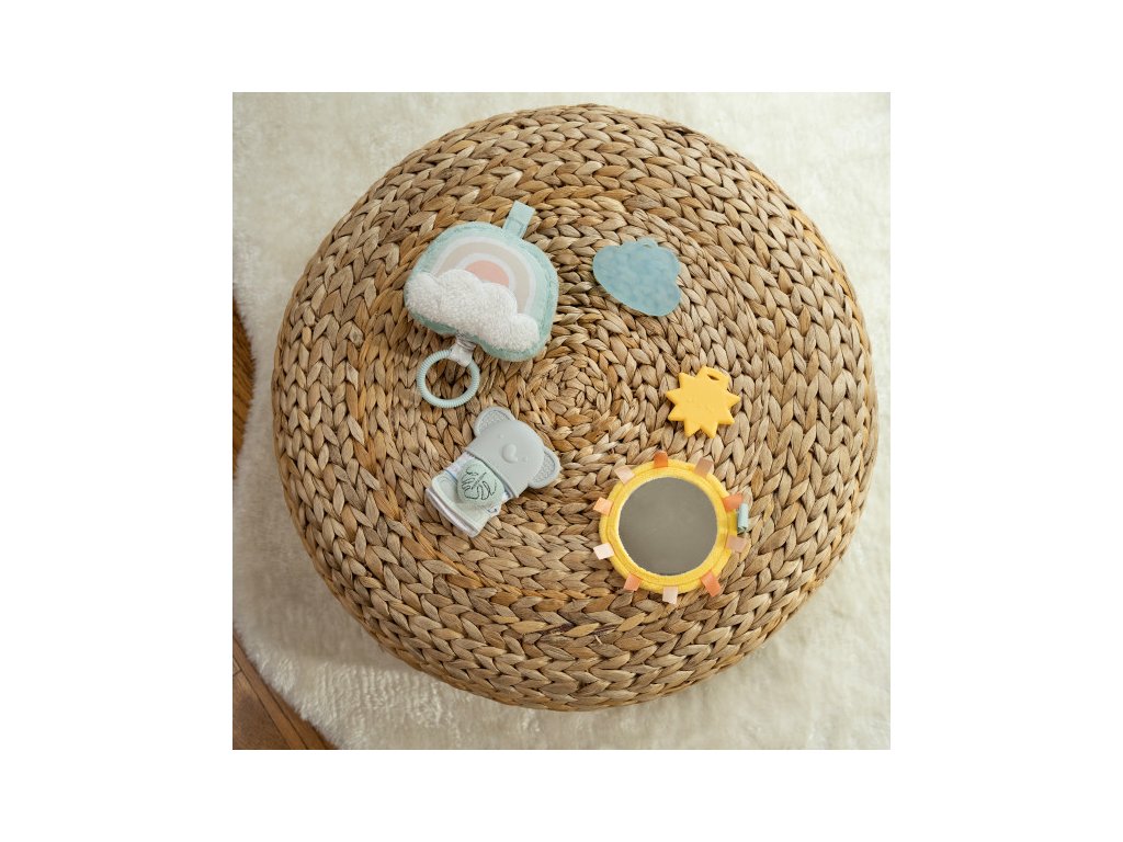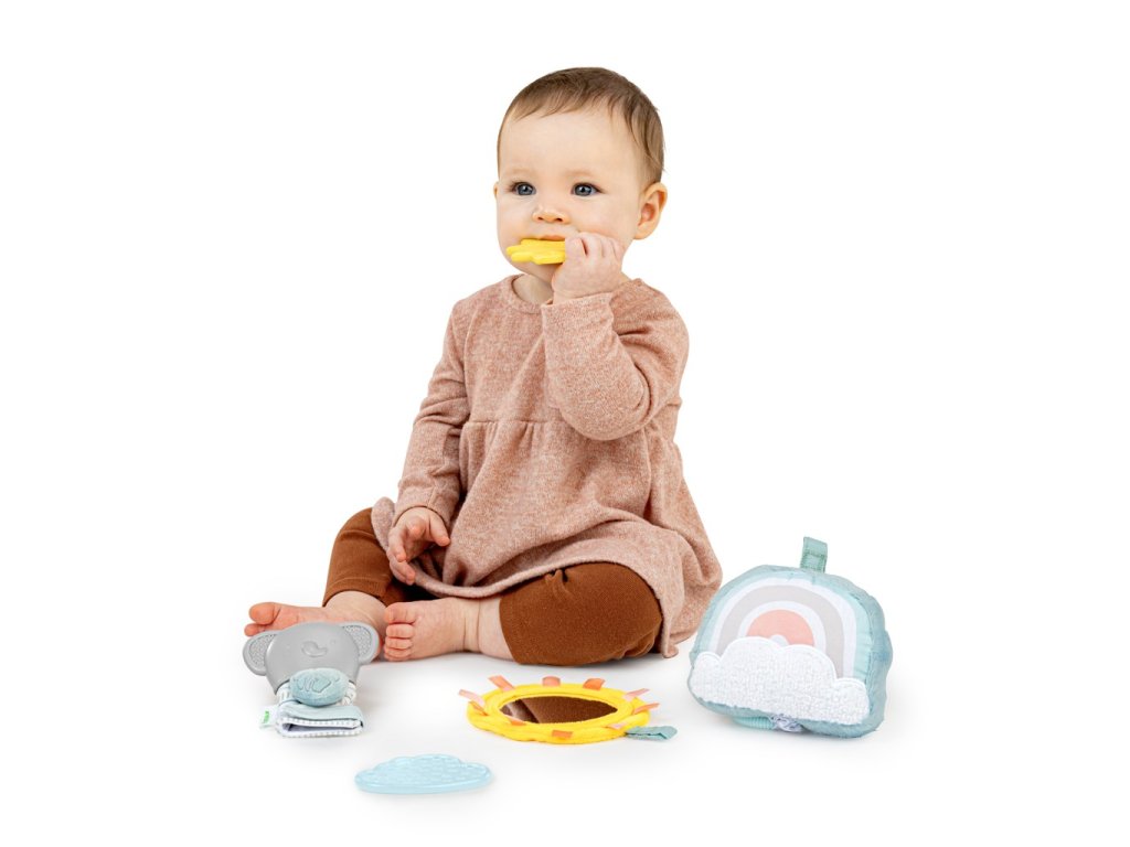 A készlet tartalmaz egy zenélő plüssjátékot, egy Van az elefánt rágókát, egy címkés napfénytükröt és 2 BPA-mentes rágókát. Az ötrészes készlet háromféleképpen vonja be a baba érzékeit: a zenélő plüssjáték lágy hangokkal nyugtat, a rágókesztyű és a rágókák enyhítik a fájó ínyt, a címkés napfénytükör pedig nyugtató felfedezést kínál. A készlet támogatja a baba tapintási készségeit azáltal, hogy különféle textúrájú és anyagú alapvető eszközöket tartalmaz.