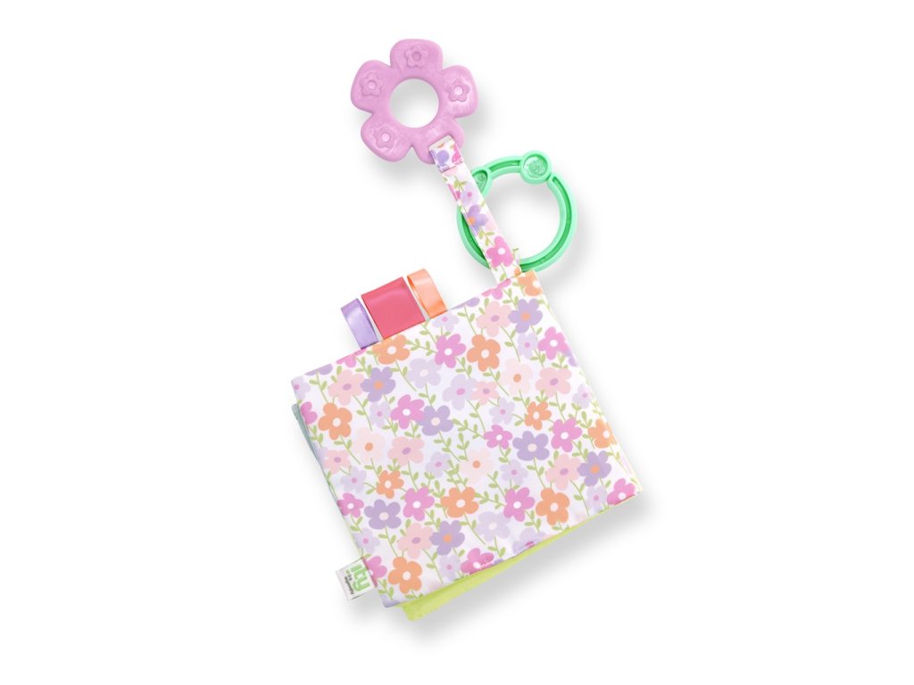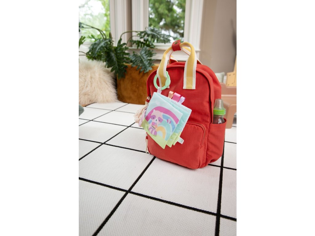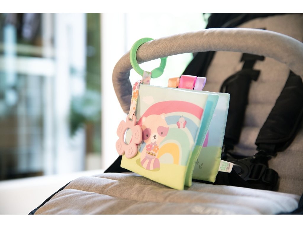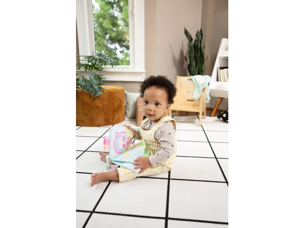 - A puha könyv számos textúrát tartalmaz, amelyek kapcsolatban tartják a gyermeket, például susogó anyagot (belül rejtve) és 3 címkét szaténszalaggal. A címkék támogatják az önmegnyugtatást, és egyben segítik a gyermek finommotorikájának fejlesztését.