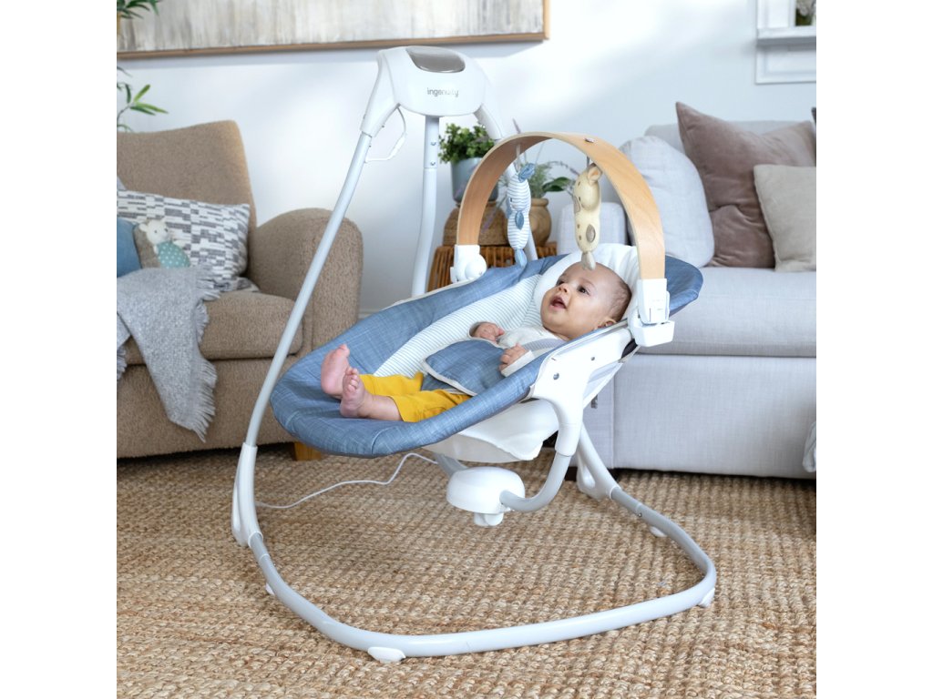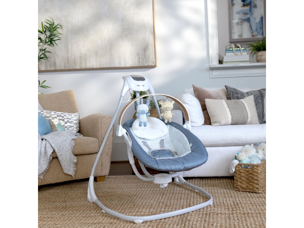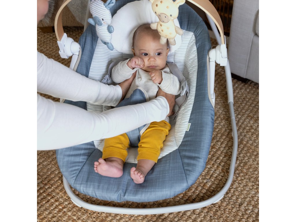 Szórakoztassa gyermekét a kompakt Ingenuity SimpleComfort – Chambray hintával.