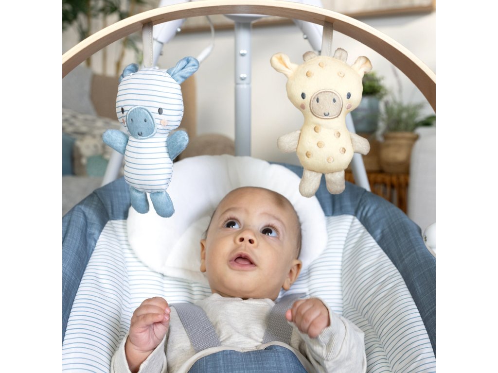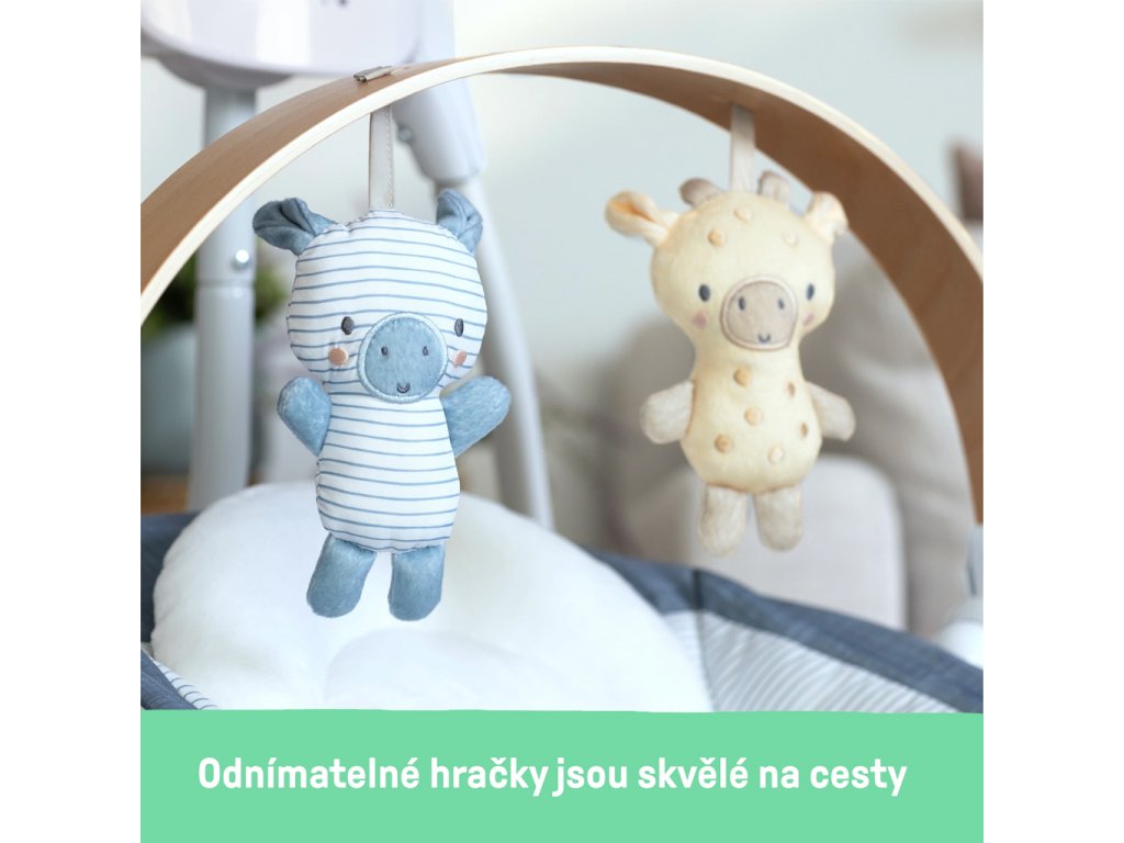 - 2 interaktív játék tartalmazza a Loni lajhárt és egy szuper aranyos mosolygós napocskát, amelyek színes játékra ösztönző ingereket biztosítanak; a játékok levehetők a szórakozáshoz útközben.