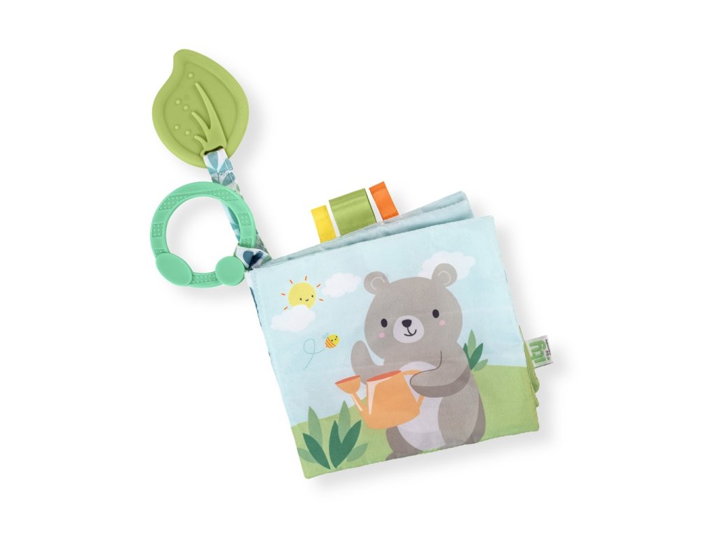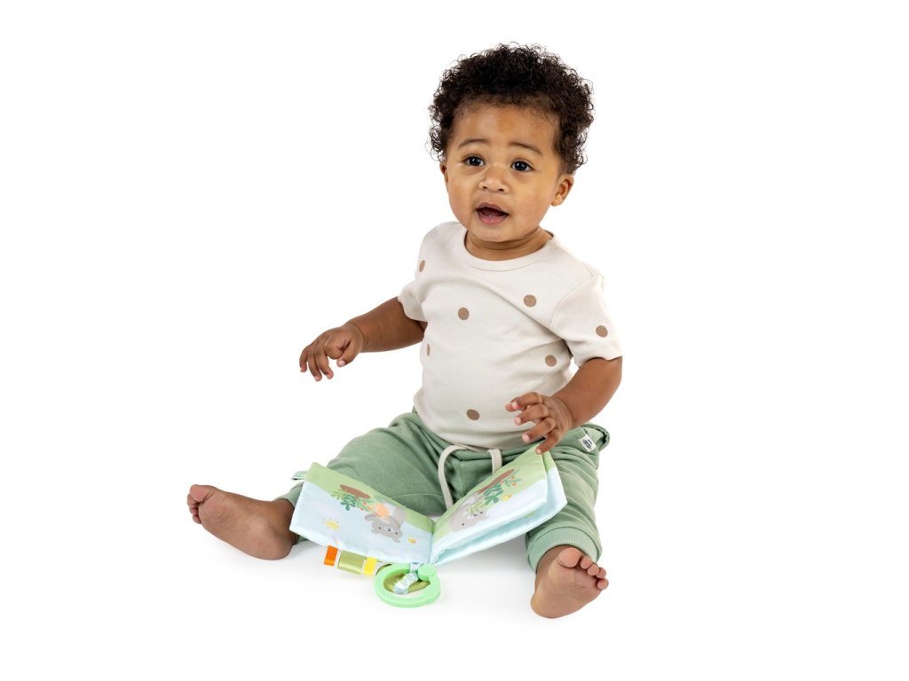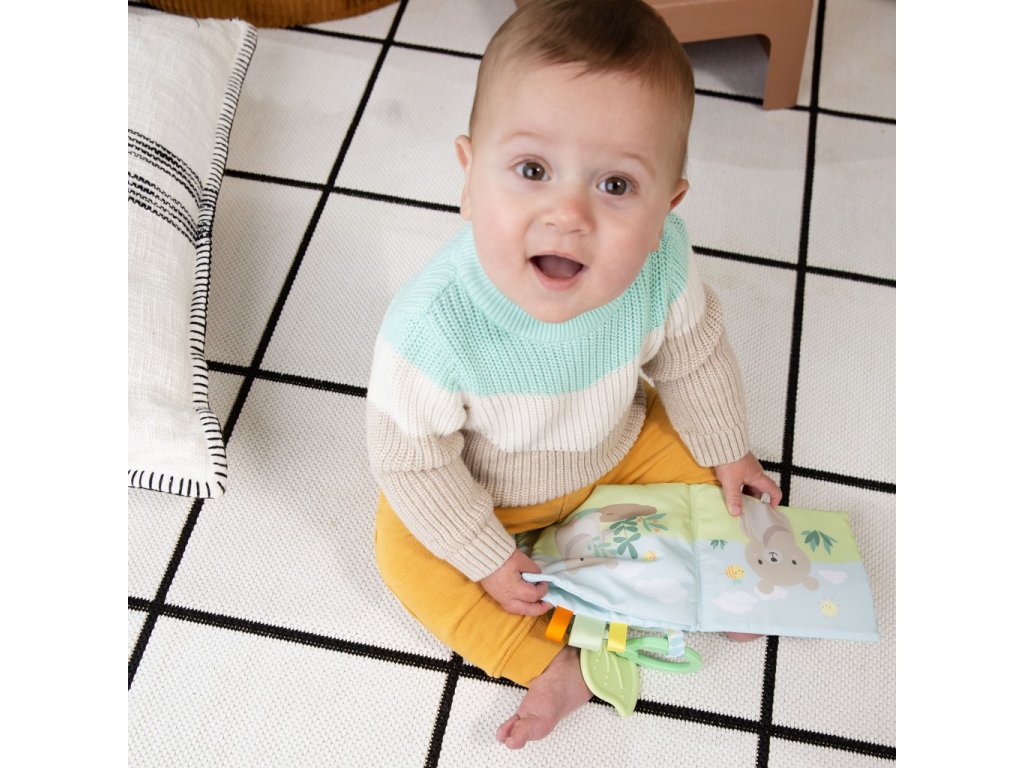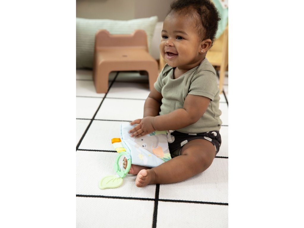 - A puha könyv számos textúrát tartalmaz, amelyek kapcsolatban tartják a gyermeket, például susogó anyagot (belül rejtve) és 3 címkét szaténszalaggal. A címkék támogatják az önmegnyugtatást, és egyben segítik a gyermek finommotorikájának fejlesztését.