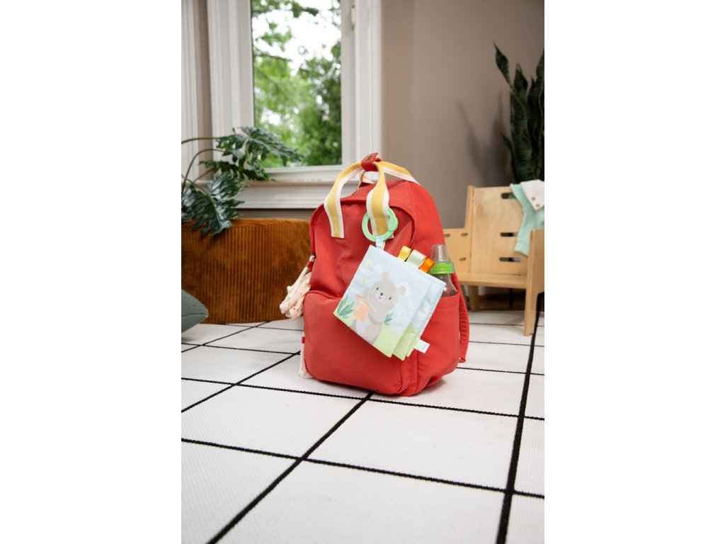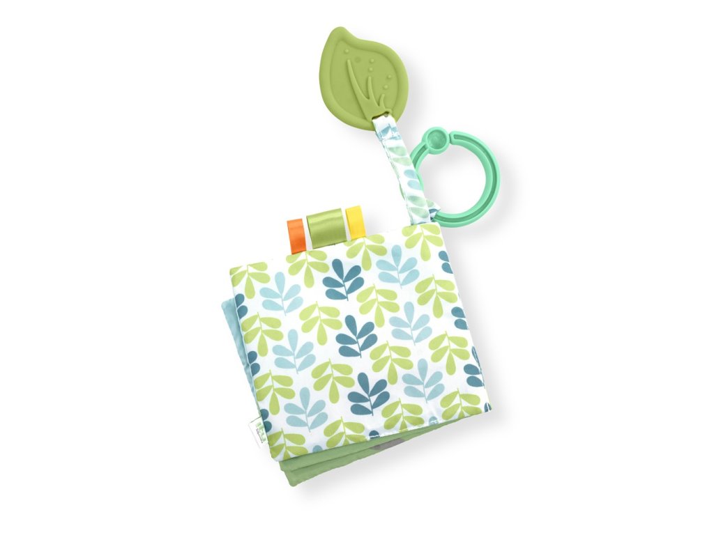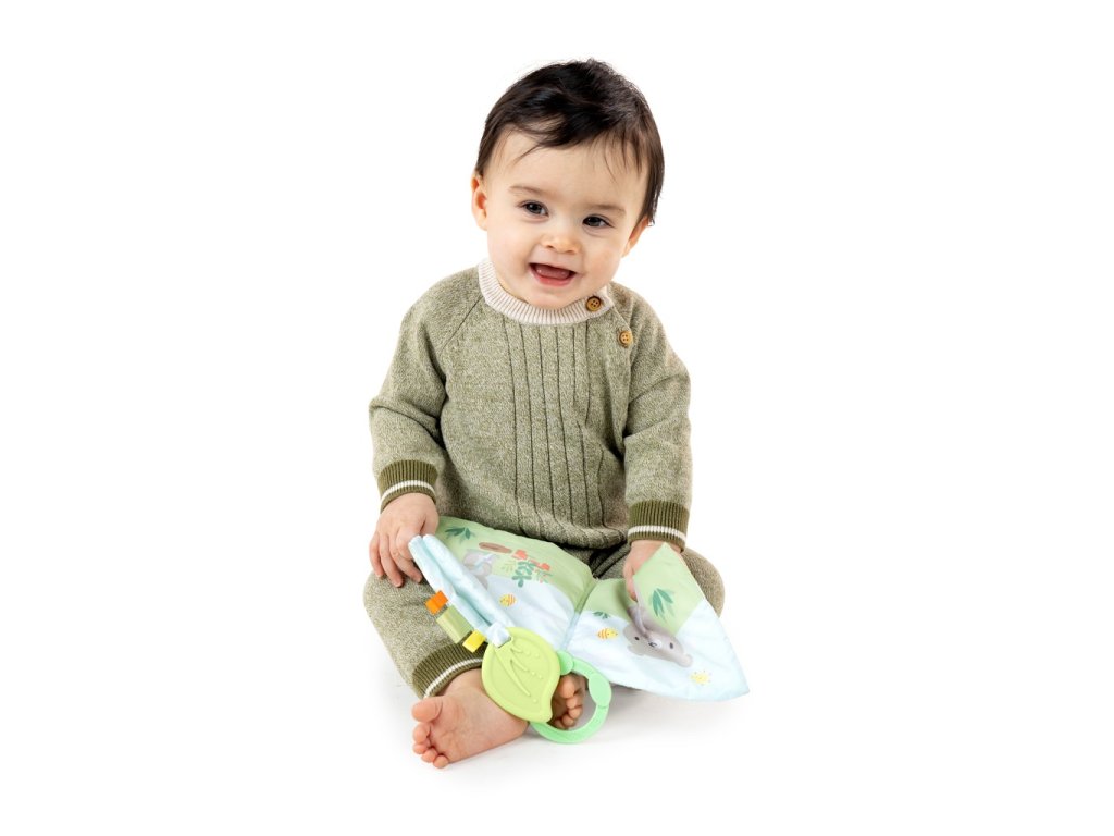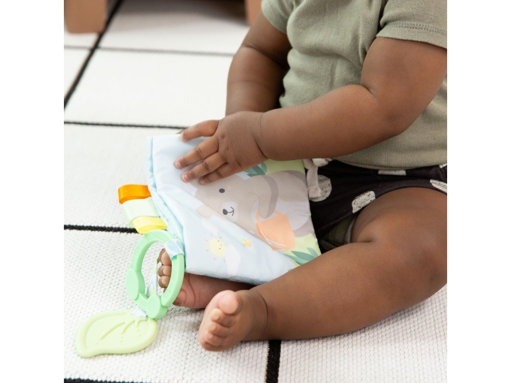 - A puha könyv számos textúrát tartalmaz, amelyek kapcsolatban tartják a gyermeket, például susogó anyagot (belül rejtve) és 3 címkét szaténszalaggal. A címkék támogatják az önmegnyugtatást, és egyben segítik a gyermek finommotorikájának fejlesztését.