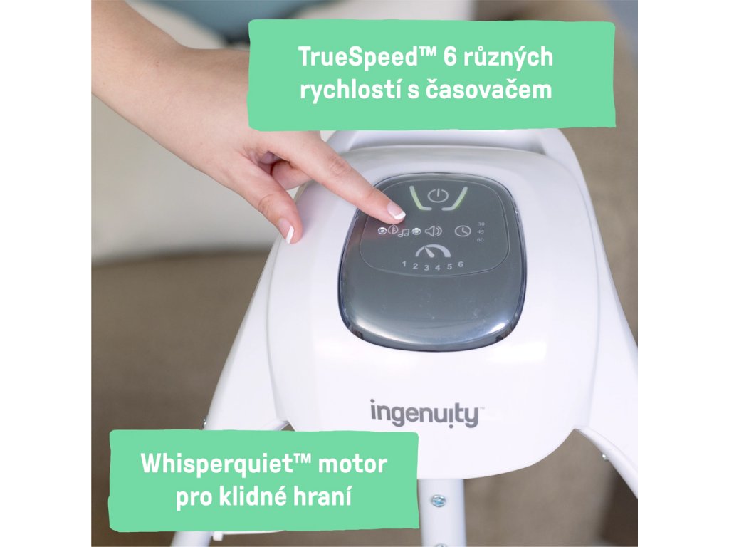 - A WhisperQuiet motor nyugodt hintázási élményt nyújt a babának. Amikor a babának szórakozásra van szüksége, a hintánk 8 dallamot és 3 gyengéd természeti hangot játszik le. A hintázó mozgást és a zenét USB-kábel táplálja (a csomag tartalmazza).