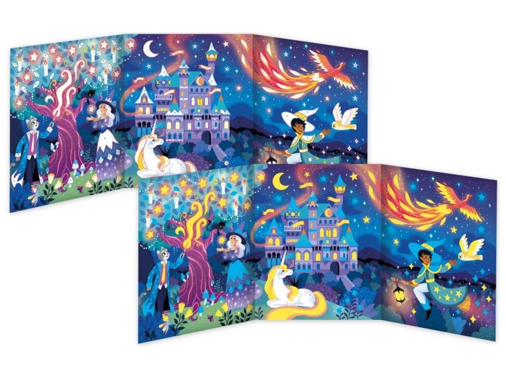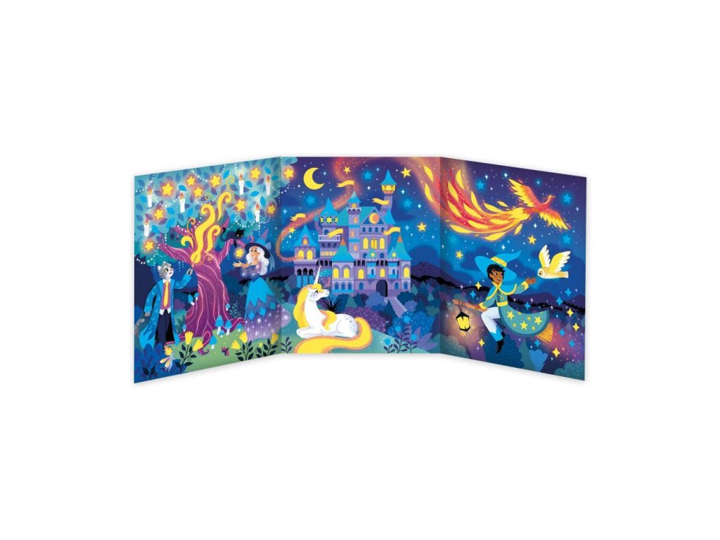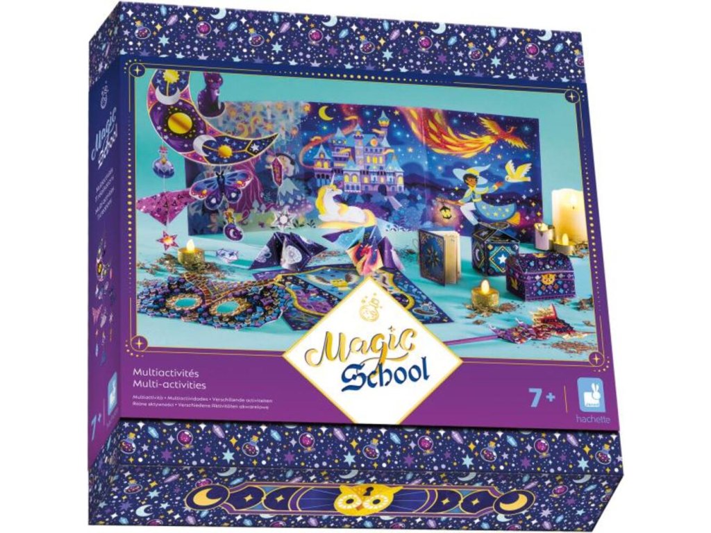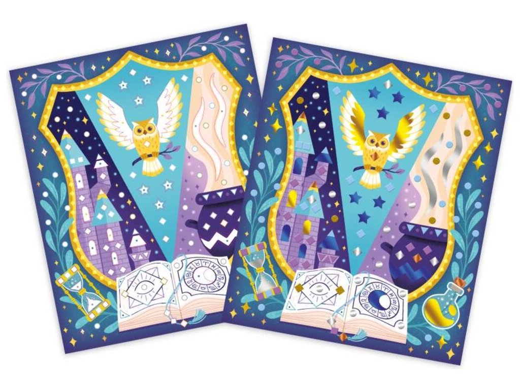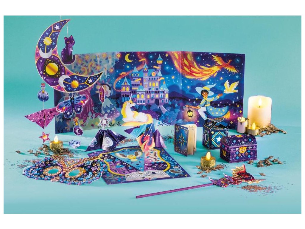 Ez a multifunkcionális készlet tartalmaz 1 triptichon homokképet, 1 maszkot, 1 varázspálcát és 1 varázsló címert öntapadós habmozaik kiegészítéséhez, 1 holdfogót origami díszítéséhez, 3 papír jósnőt matricákkal való testreszabáshoz, 2 kis dobozt és 1 varázskönyvet az összeállításhoz.