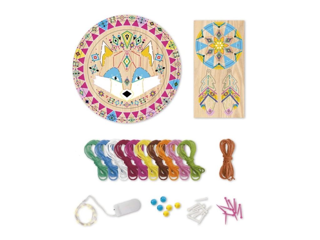 2 tábla előre vágott habformákkal, 300 műanyag szeg, 10 gombolyag pamutfonal 10 különböző színben (7 méter), 1 juta kötél (3 méter), 6 gyöngy és 1 fényfüzér elemekkel. A készlet tartalmaz egy modellkönyvet és egy útmutatót is, amely lépésről lépésre végigvezeti a kicsiket a tevékenységen.
