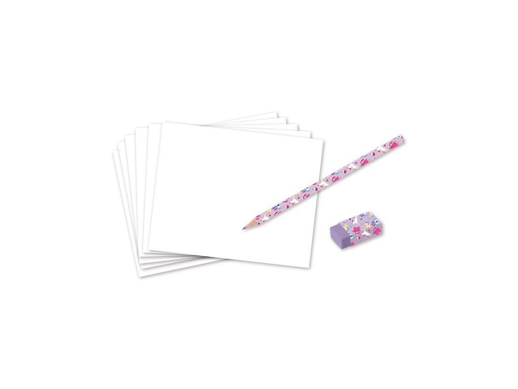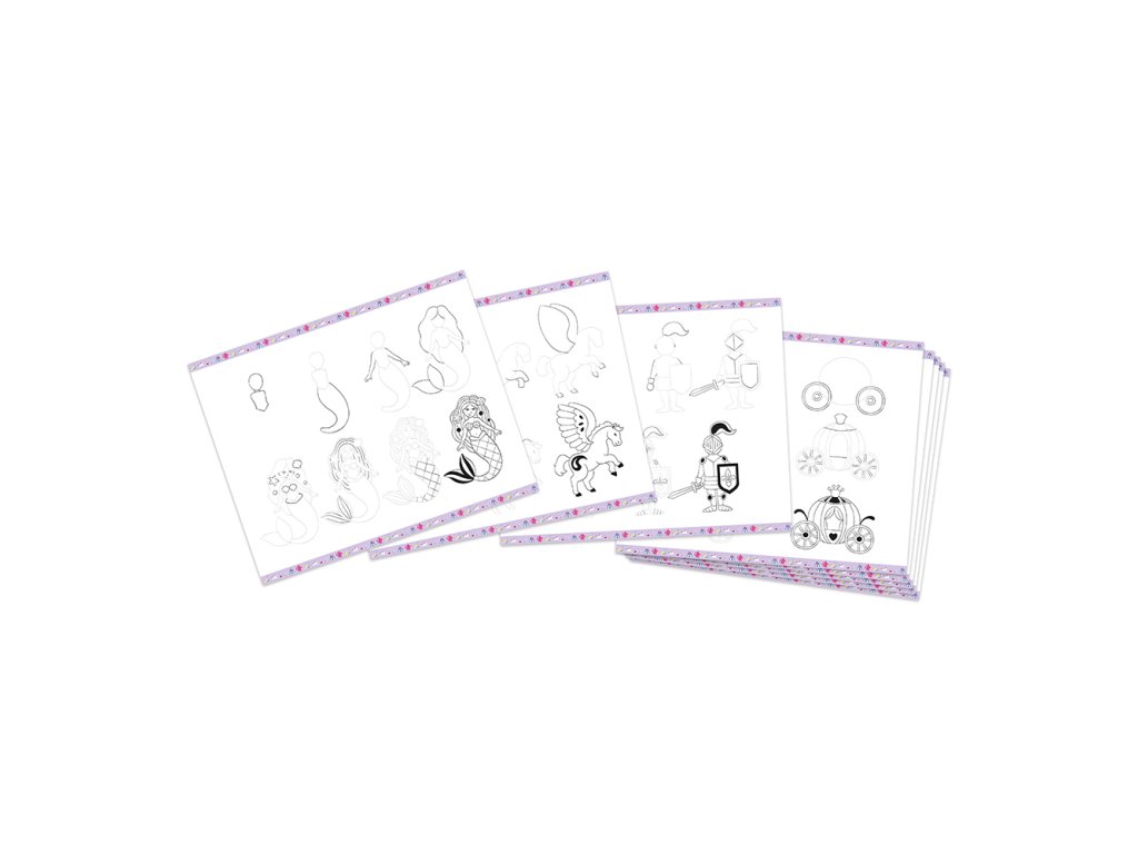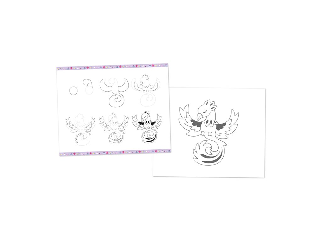 A Fantastic Creatures kreatív készlet 20 mintalapot tartalmaz, lépésről lépésre másolható mintákkal, 25 üres papírlapot, HB ceruzát és radírt.