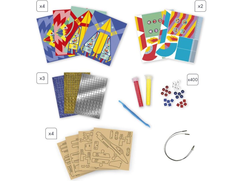 Ezzel a kreatív készlettel gyermekei saját repülőgépeket, rakétákat és maszkokat készíthetnek, és flitterekkel és matricákkal díszíthetik őket.