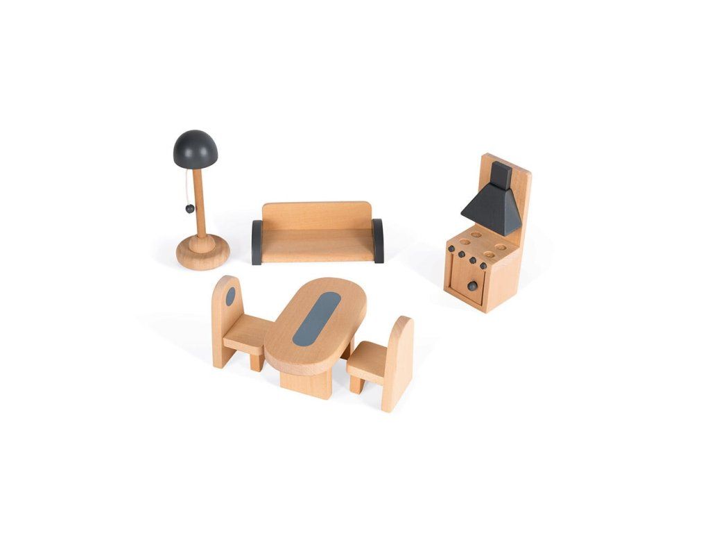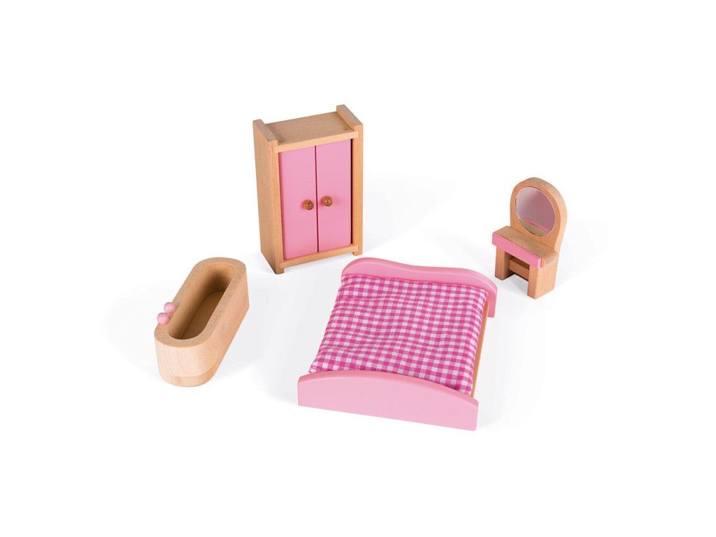 11 kiegészítő a házikó díszítéséhez: szekrény nyitható ajtókkal, ágy takarókkal, fésülködőasztal, kád, kanapé, lámpa, asztal, 2 szék és konyha. Egyszerű összeszerelés.