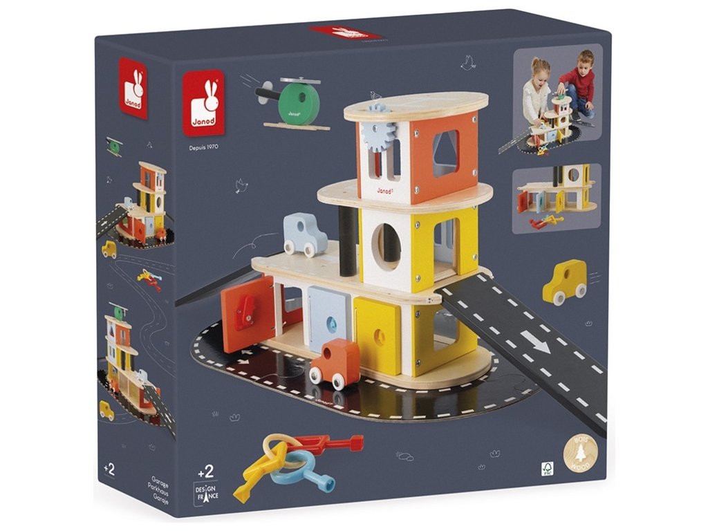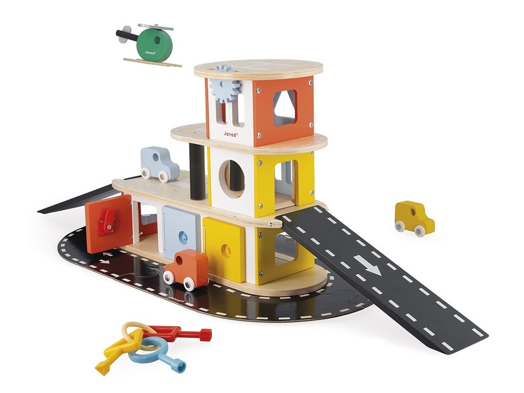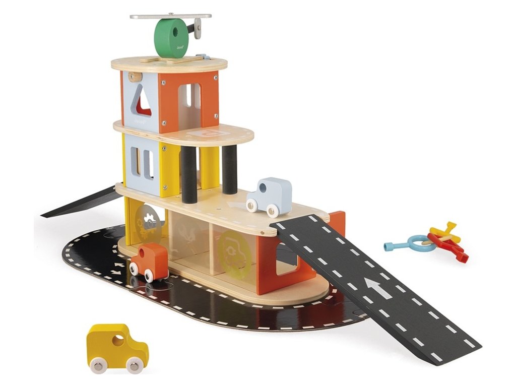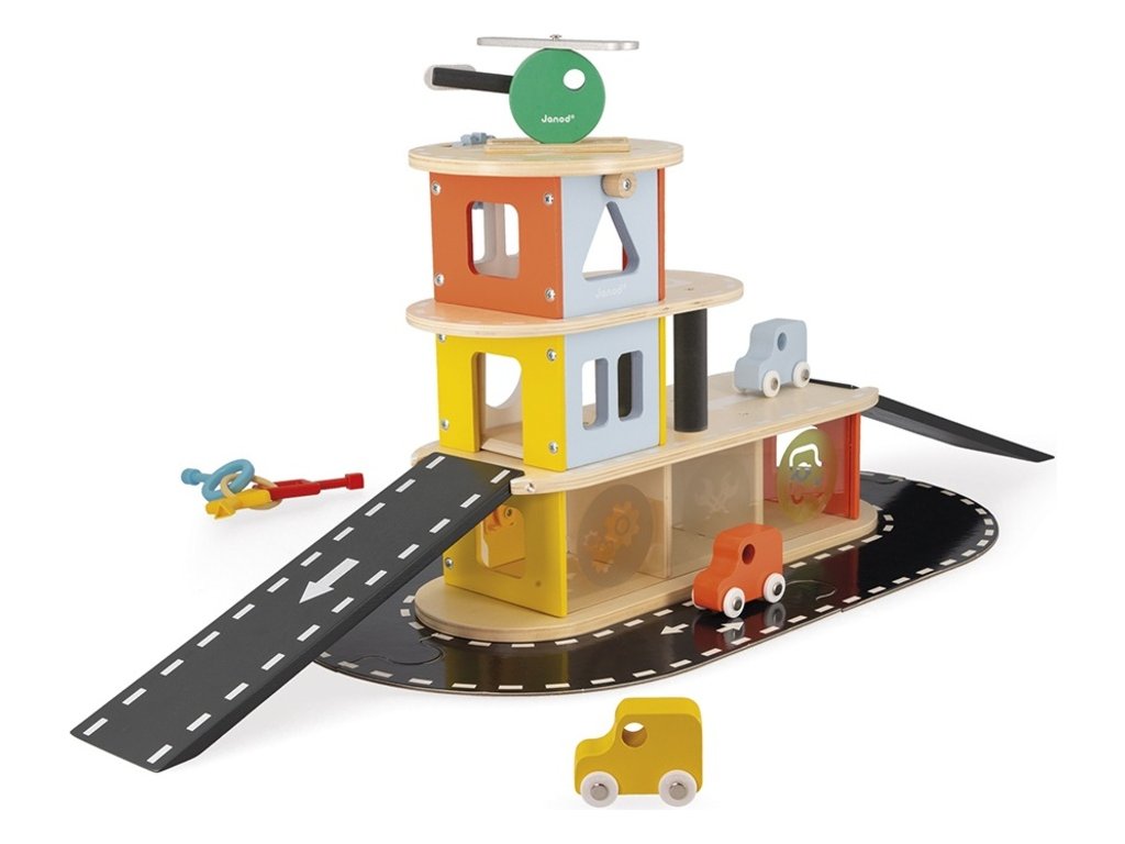 Órákig tartó játék garantált ezzel a fa garázzsal, a 3 autóval és a helikopterrel.