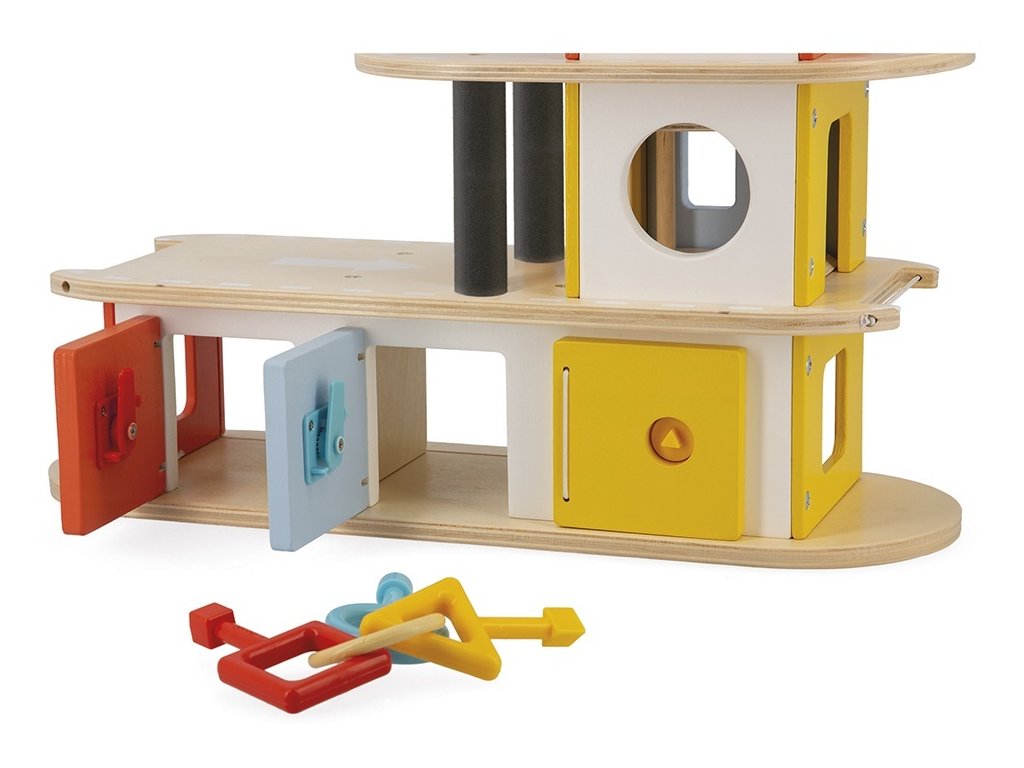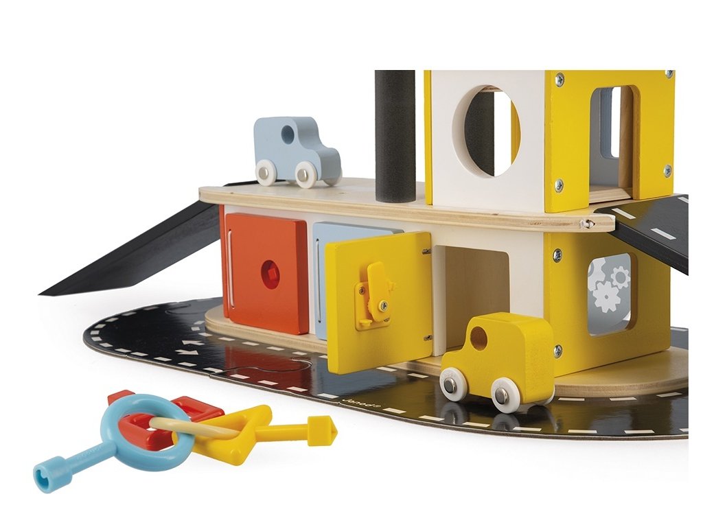 Vroom vroom! Itt a csúcsforgalom! Itt van egy autósor, amely be- és kihajt, hogy rámpákon és lifttel jussanak el a parkolóba, vagy kihasználják az automatikus autómosó előnyeit... Eljön az éjszaka, és itt az ideje, hogy az autót a garázsba tegyük. Egy valódi, működő garázs, amely a testre szabott kulcsoknak és záraknak köszönhetően nyílik, amelyek minden ajtót egyedivé tesznek.