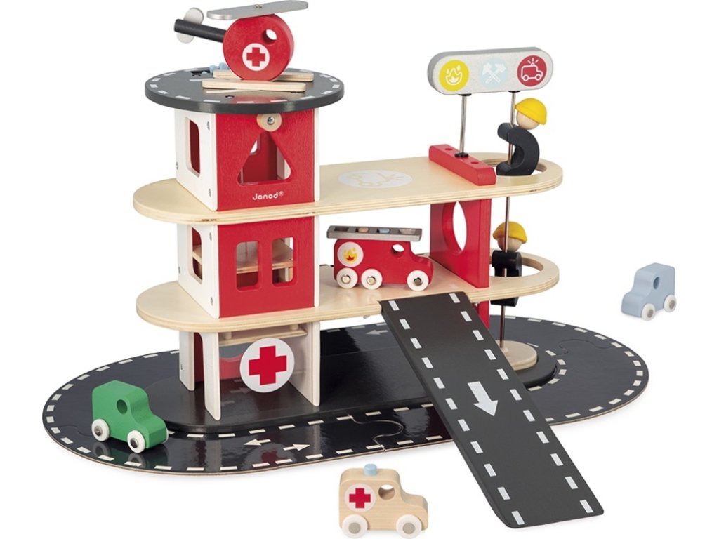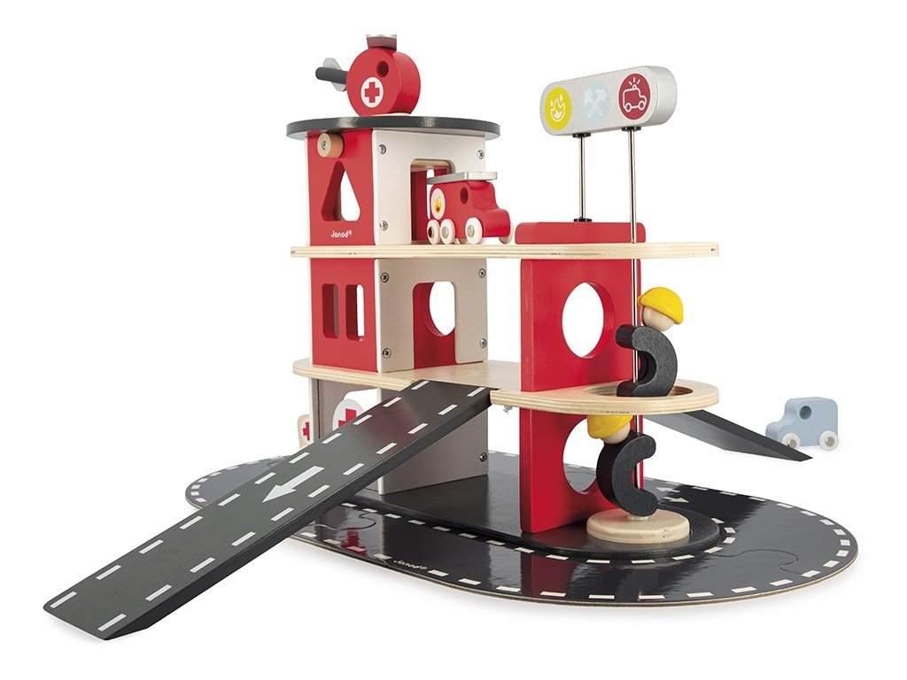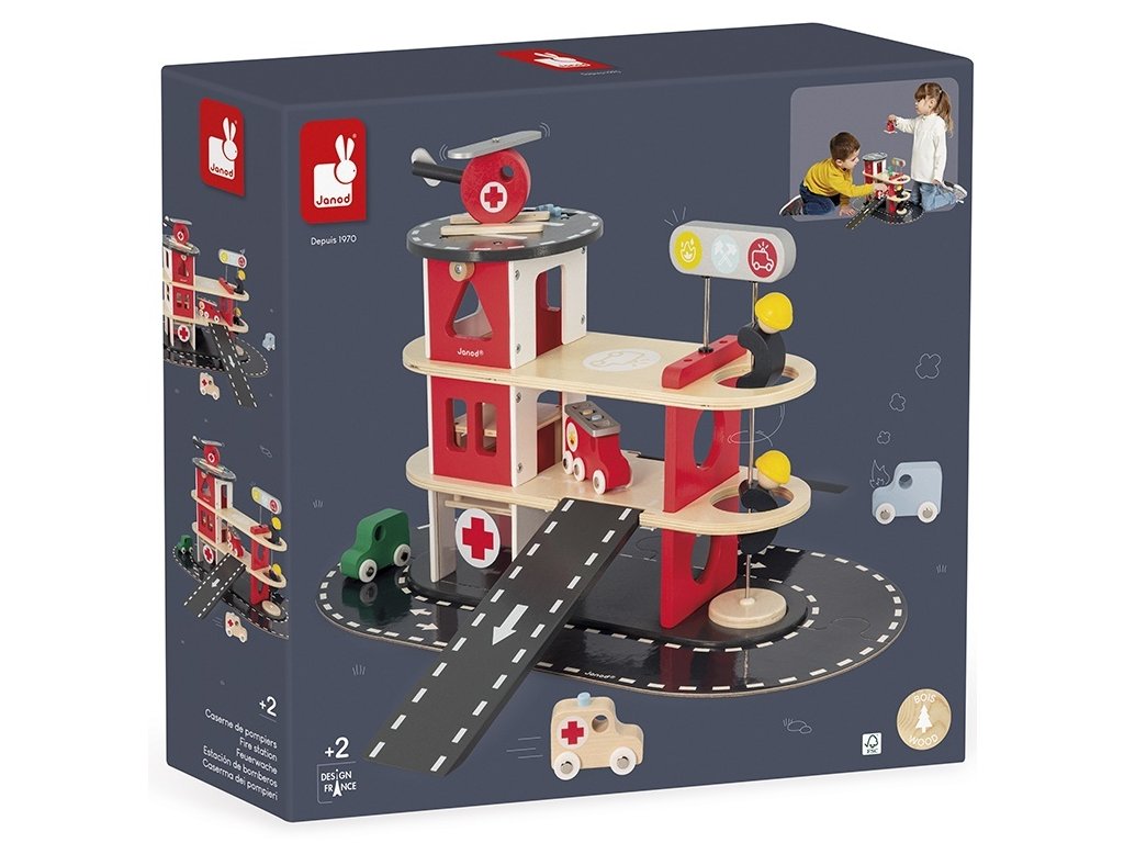 Sziréna szól, engedje át a tűzoltókat! Hagyja, hogy gyermeke felfedezze a tűzoltók mindennapi életét. Ez a praktikus fa tűzoltóállomás 2 tűzoltóból áll, akik lecsúszhatnak a rúdon, helikopterből és 4 járműből: 2 autóból, 1 mentőautóból és 1 tűzoltóautóból, levehető létrával. Mindenki használhatja a rámpákat, a liftet és a tűzoltóállomás körüli kört, hogy elérje a tűz helyszínét!
