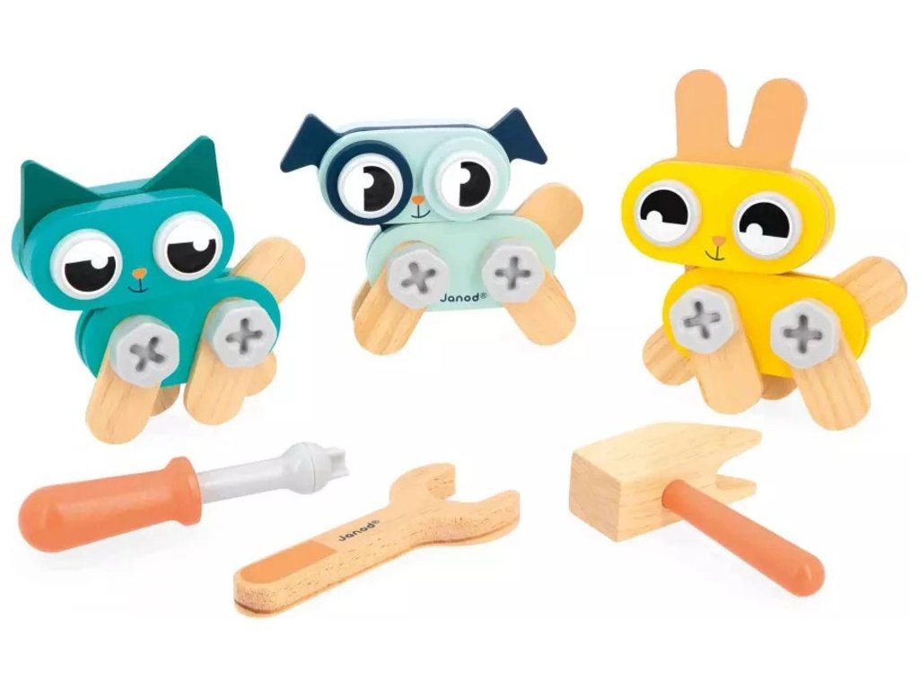 3 szerszámmal, 32 fa alkatrésszel és 18 műanyag elemmel (csavarok, anyák, betétek) gyermeke életre keltheti a választott kis társat: 1 kutyát (18 darab), 1 macskát (16 darab) vagy 1 nyulat (16 darab).