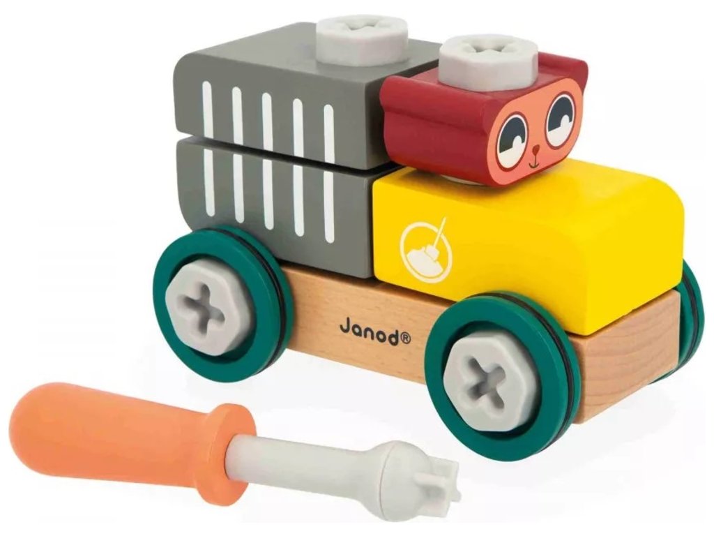 9 fa alkatrészből, 16 műanyag alkatrészből (csavarok, anyák, betétek) és egy csavarhúzóból áll, gyermeke megtapasztalja az első DIY pillanatokat. A csomag tartalmaz egy modellkártyát, amely megkönnyíti a jármű összeszerelését.