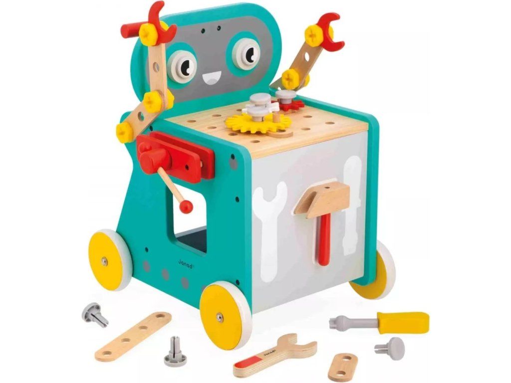 Janod BricoKids Fa járássegítő és szerszámos kocsi Robot 38 db