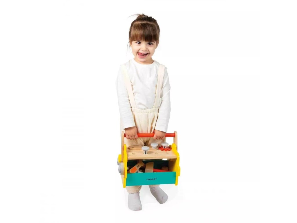 Ez a szép szerszámkészlet 3 szerszámmal és 13 fa tartozékkal érkezik: deszkák és fogaskerekek a saját konstrukciók létrehozásához. 14 műanyag tartozék: csavarozáshoz, kicsavarozáshoz és szögeléshez. Extra bónusz – a csavarok hornyoltak, ami további kihívást és több lehetőséget ad a játékra az elemek összeszerelésekor. A praktikus fogantyú rögzíthető vagy leválasztható, így a szerszámosláda könnyen bárhová magával vihető!