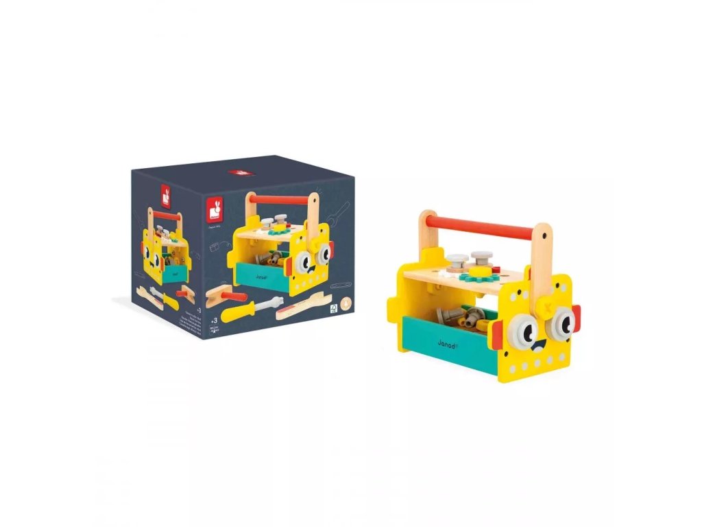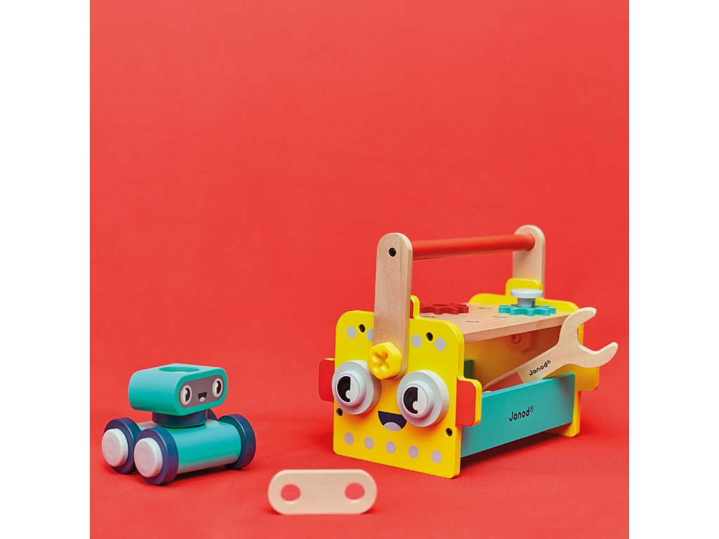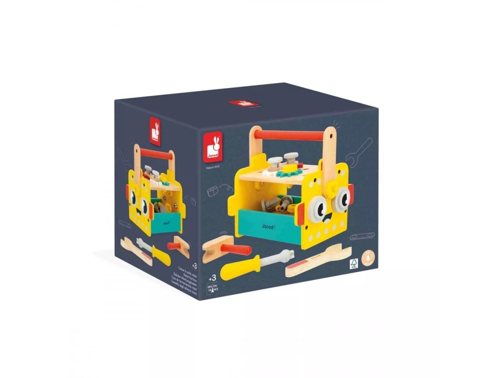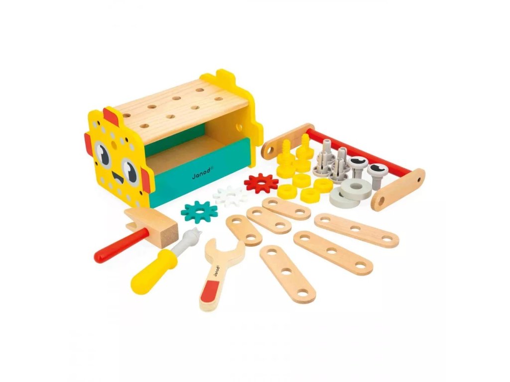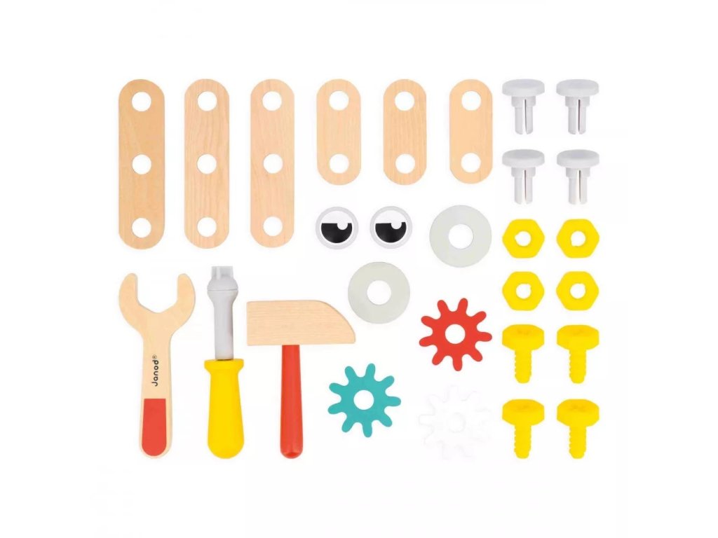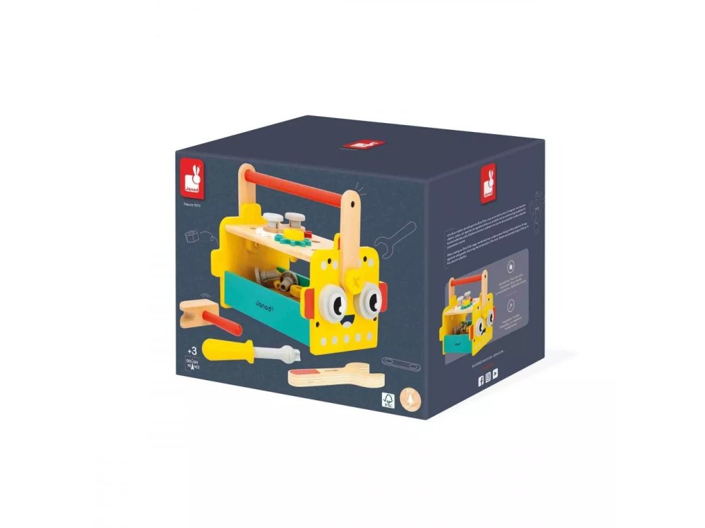 Janod BricoKids Fa szerszámok és építőkészlet hordozható Robot dobozban 30 db