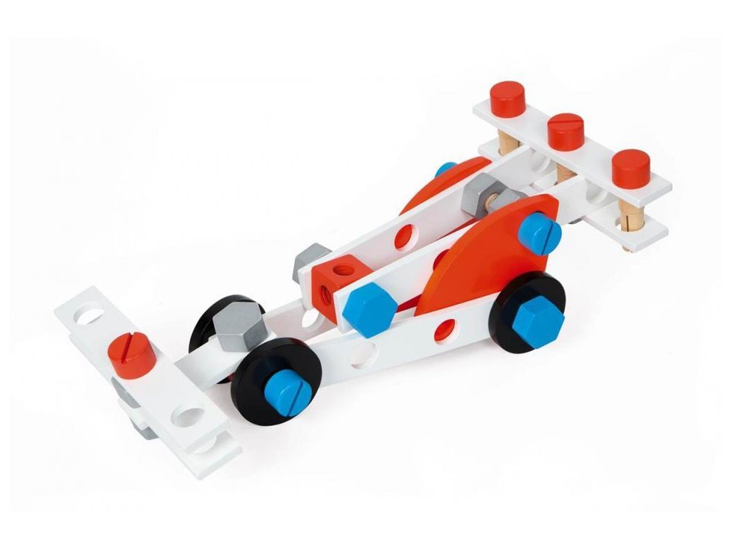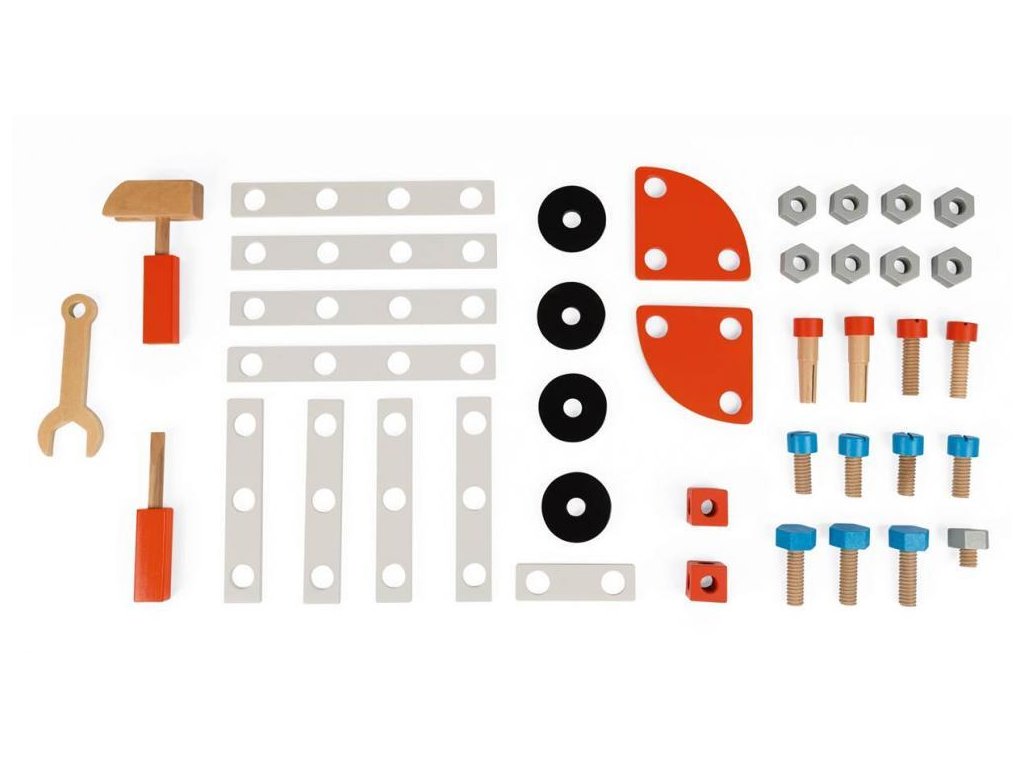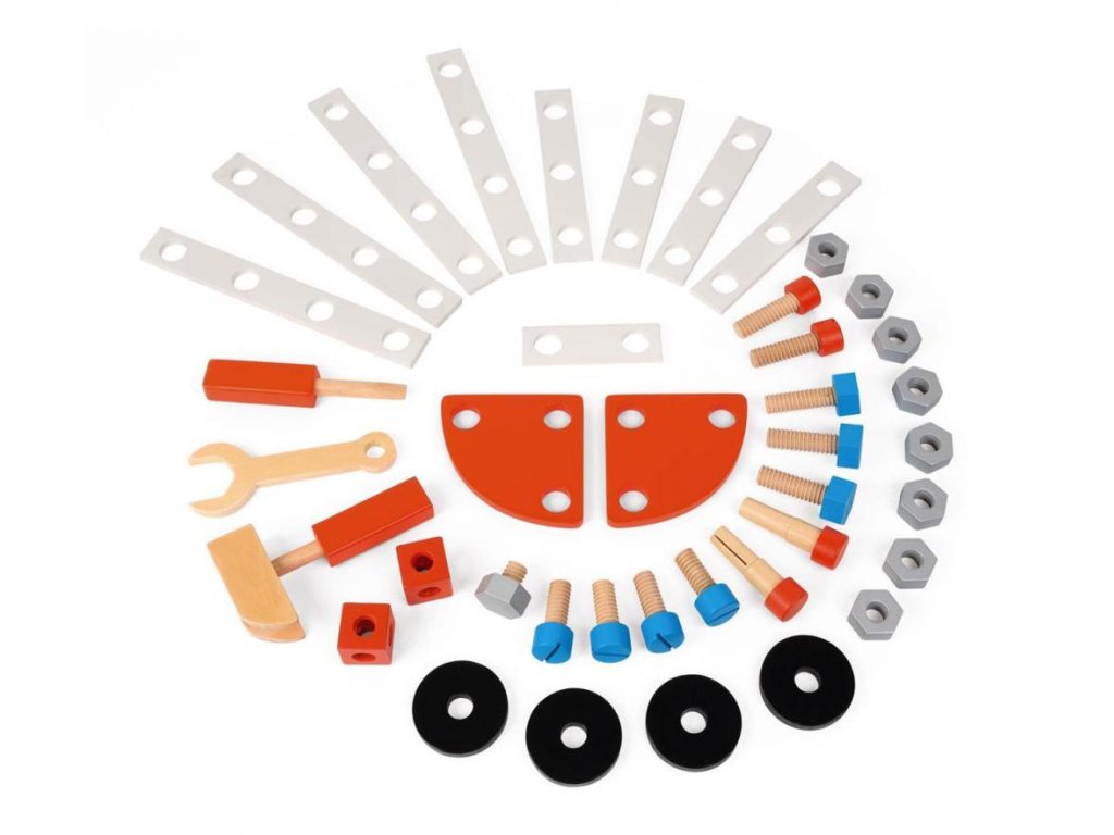 A kiegészítők között különböző csavarok, anyák, fa szerszámok találhatók, amelyek garantálják a szórakozással teli órákat és a végtelen játéklehetőségeket.
