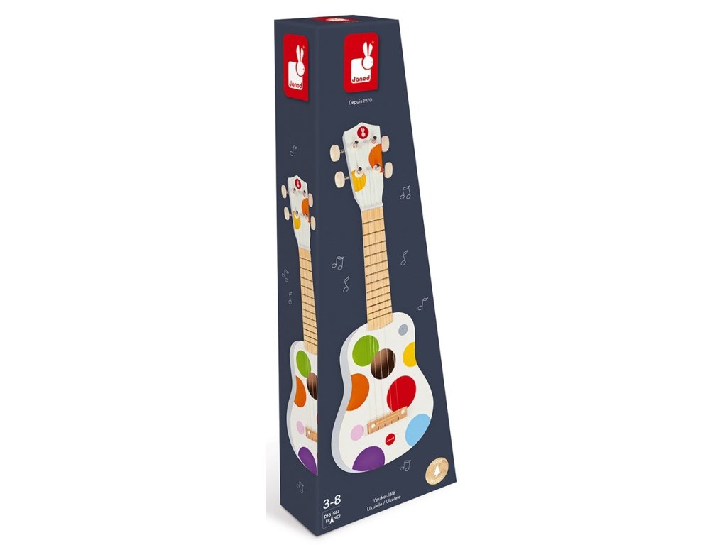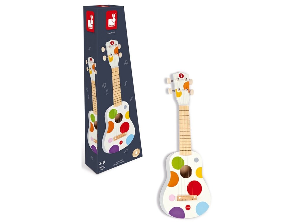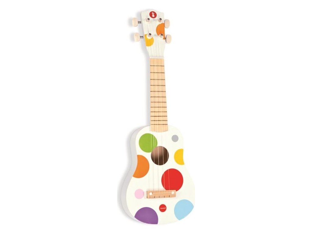 Az eredeti és minőségi, színes pöttyös gyermek ukulele 4 nejlon húrral rendelkezik.