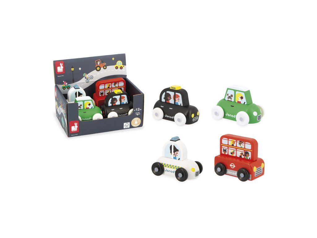 Induljon el egy kirándulásra Nagy-Britanniába ezzel a 4 imádnivaló gyűjthető járművel! Ez a kiállítás négy járművet tartalmaz: egy piros emeletes buszt, tele turistákkal, akik készen állnak a város felfedezésére, egy londoni taxit, egy rendőrautót egy rendőrrel a hagyományos brit sapkában, és egy kis zöld városi autót egy vicces bulldoggal a fedélzetén! Ezeket a járműveket kifejezetten úgy tervezték, hogy a kis kezek könnyen tudják őket kezelni. Ideális a finommotorika és a képzelőerő fejlesztéséhez. FSC™ tanúsítvánnyal rendelkező fa játék. Nincs lehetőség választásra, az ár 1 darabra vonatkozik.12 hónapos kortól.