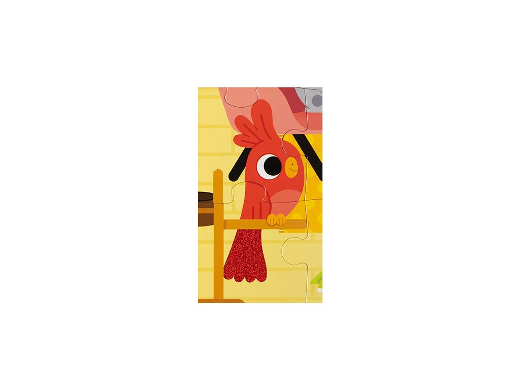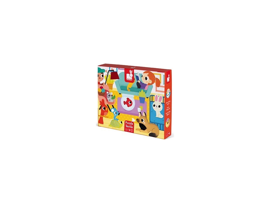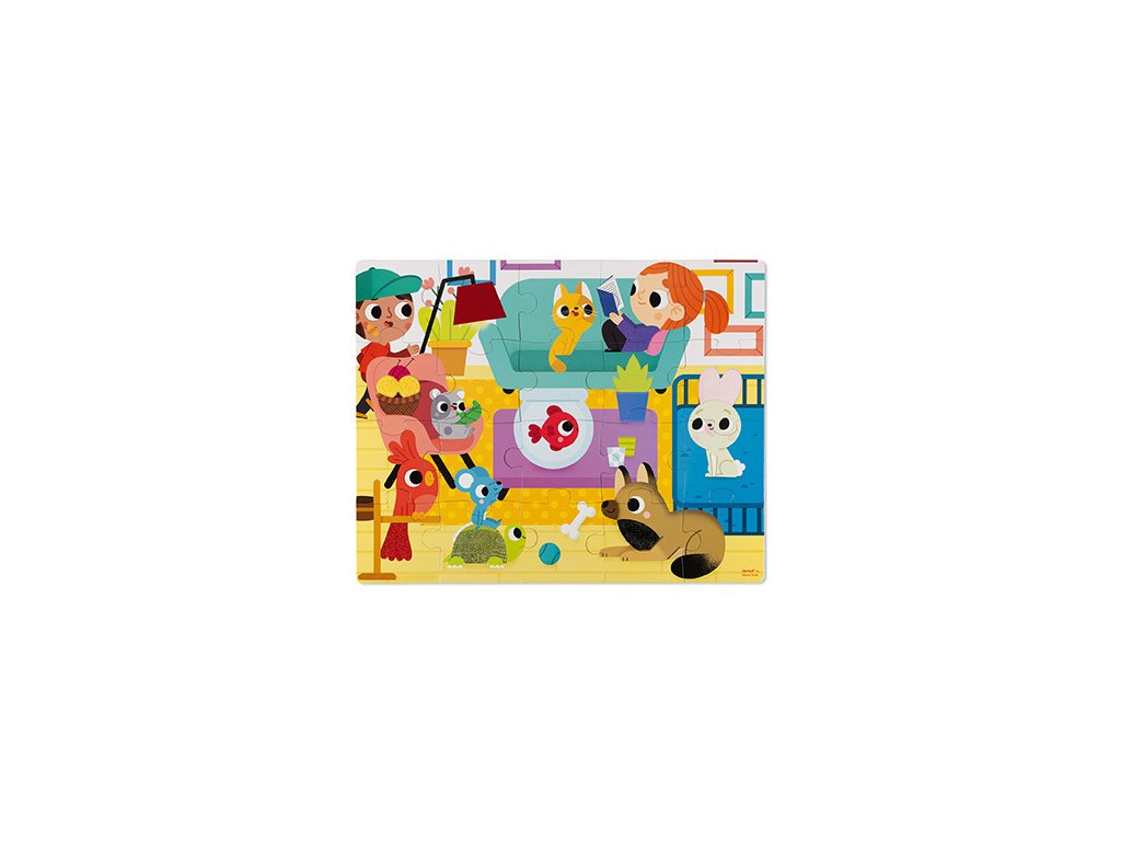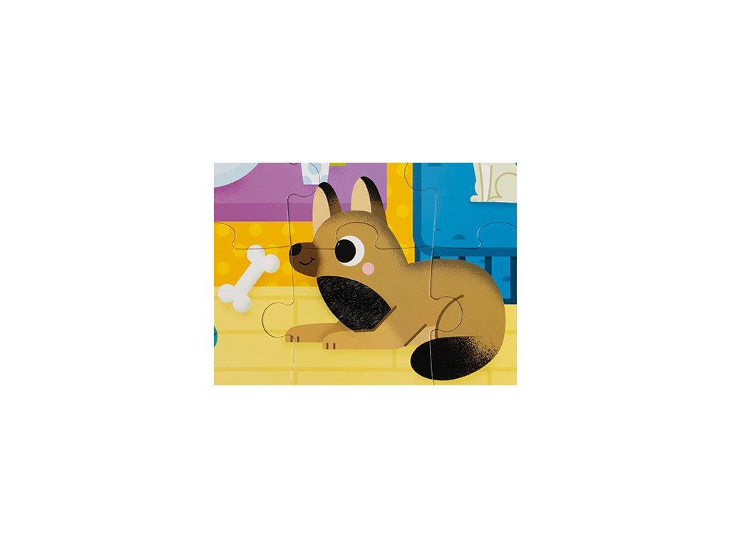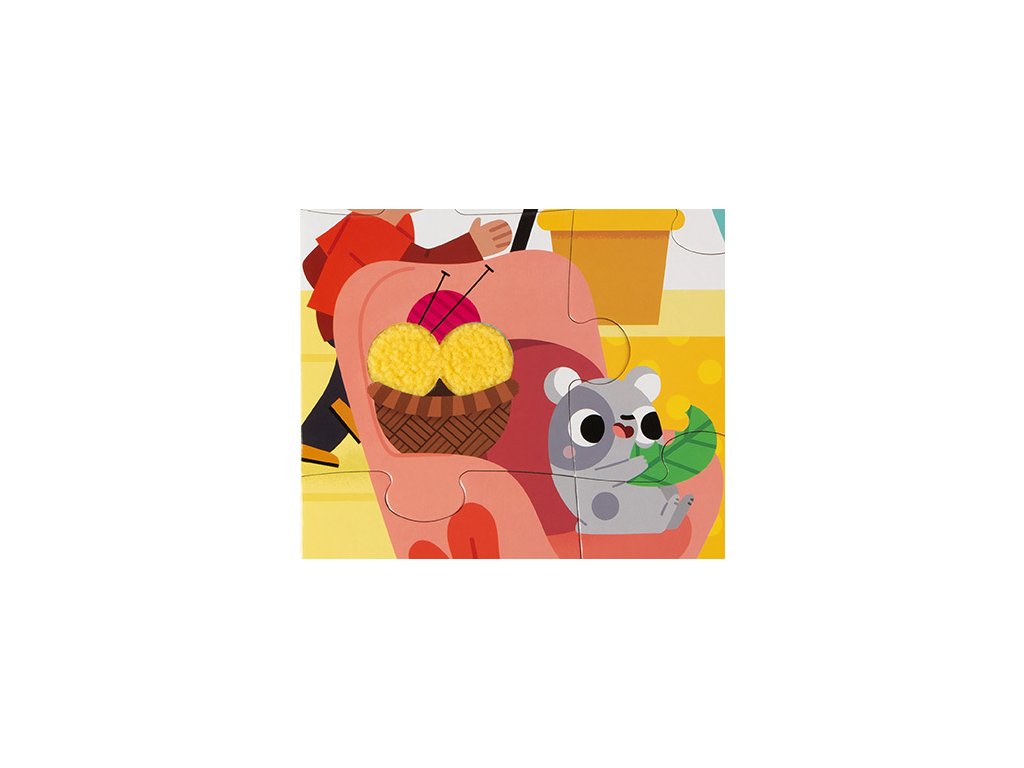 Gyermek puzzle 20 darabbal, Házi kedvencek motívummal. Néhány elem különböző anyagokból készült tapintható részeket tartalmaz az érzékszervi érzékeléshez (szőrme, csillám, bársony stb.)