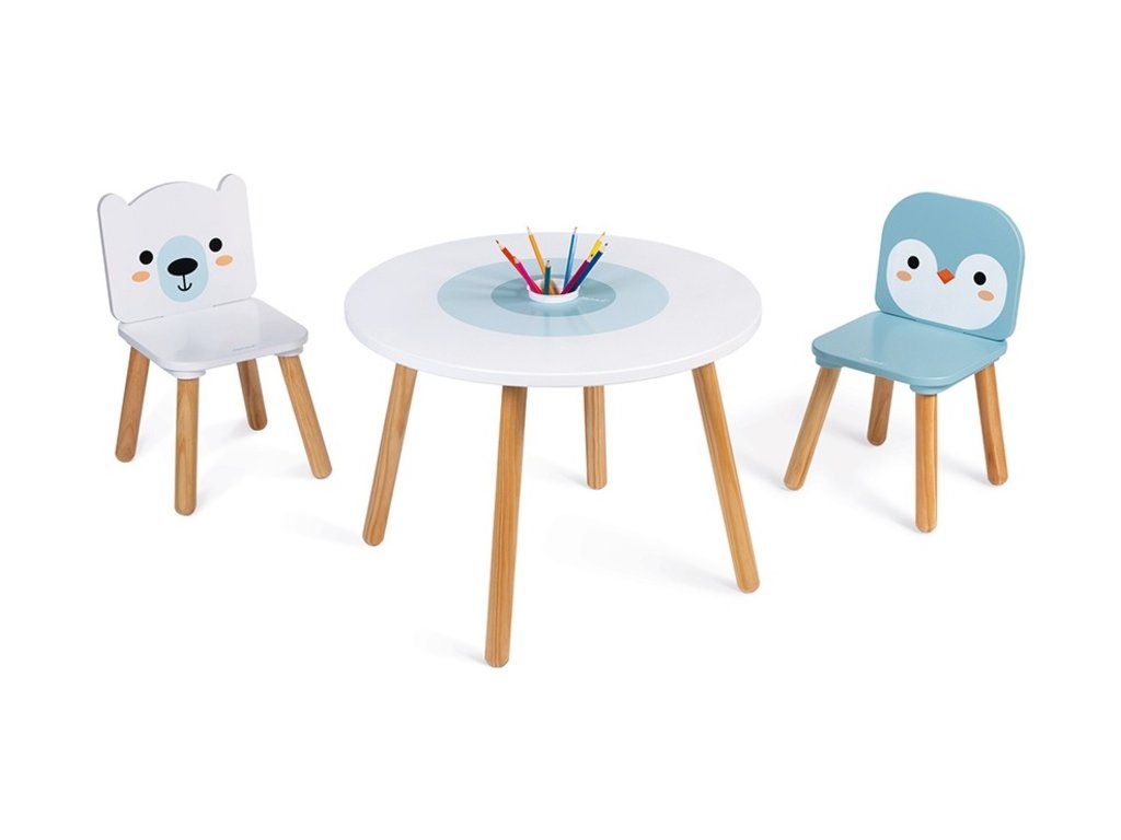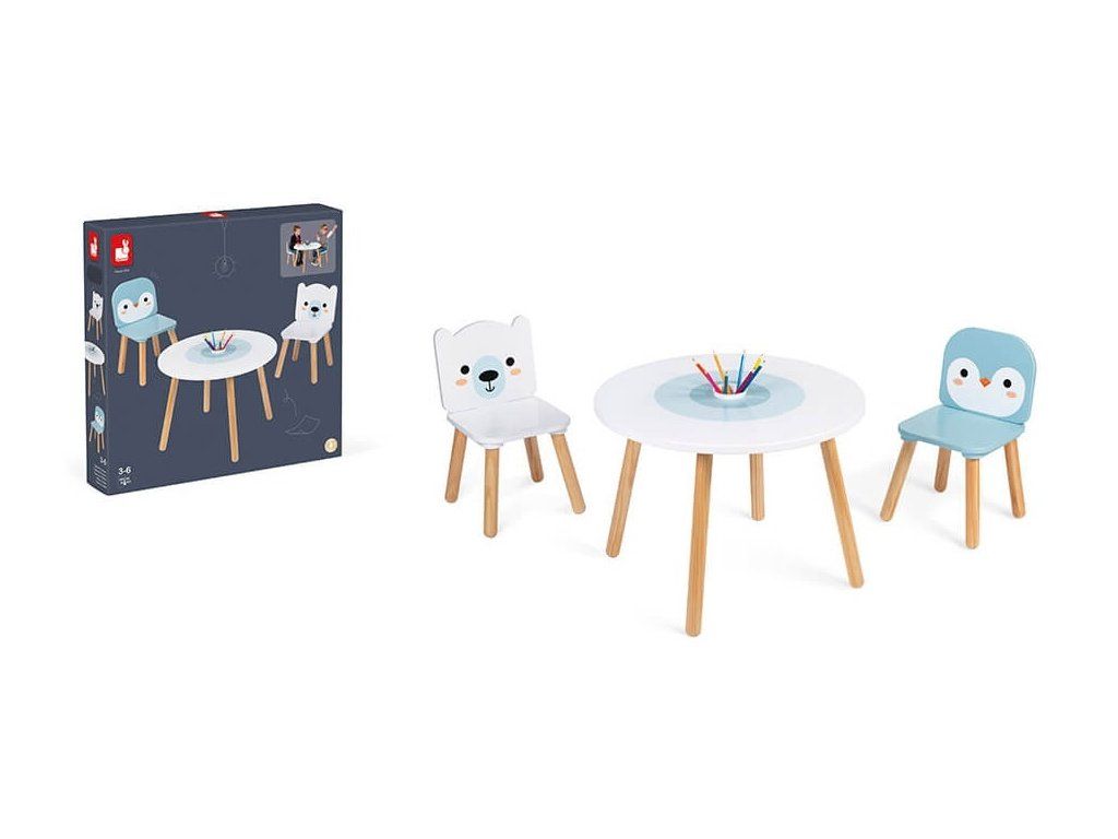 A Janod fa asztal székekkel, gyönyörű sarki állatos mintával, minden gyerekszobába illik.
