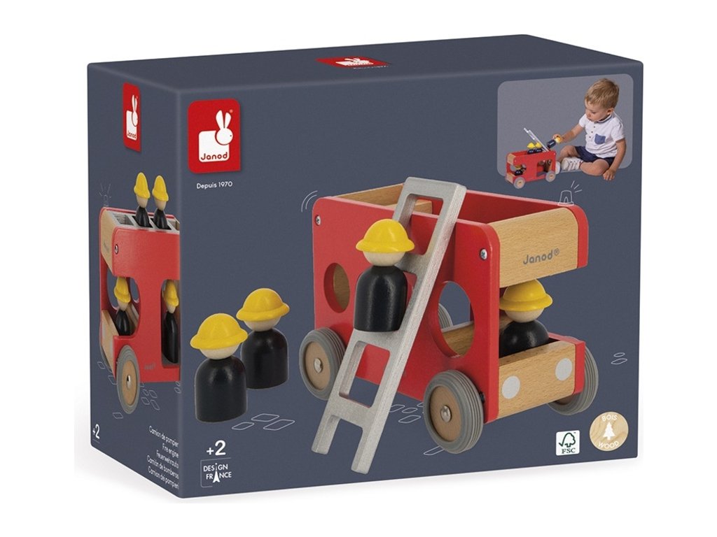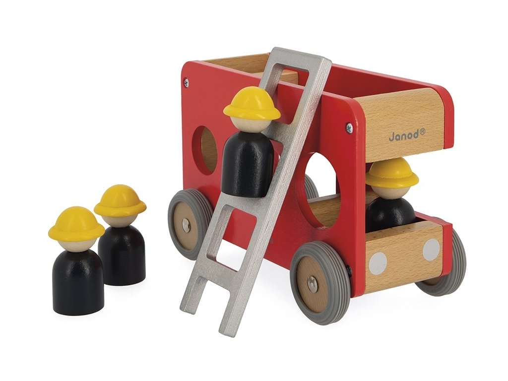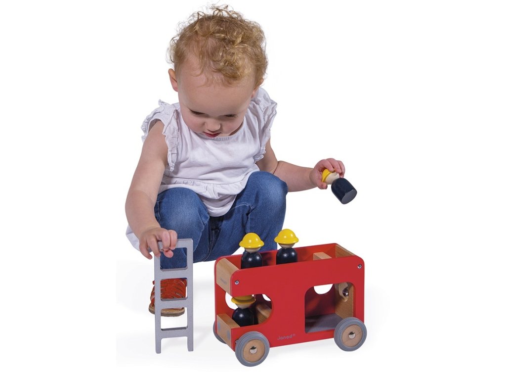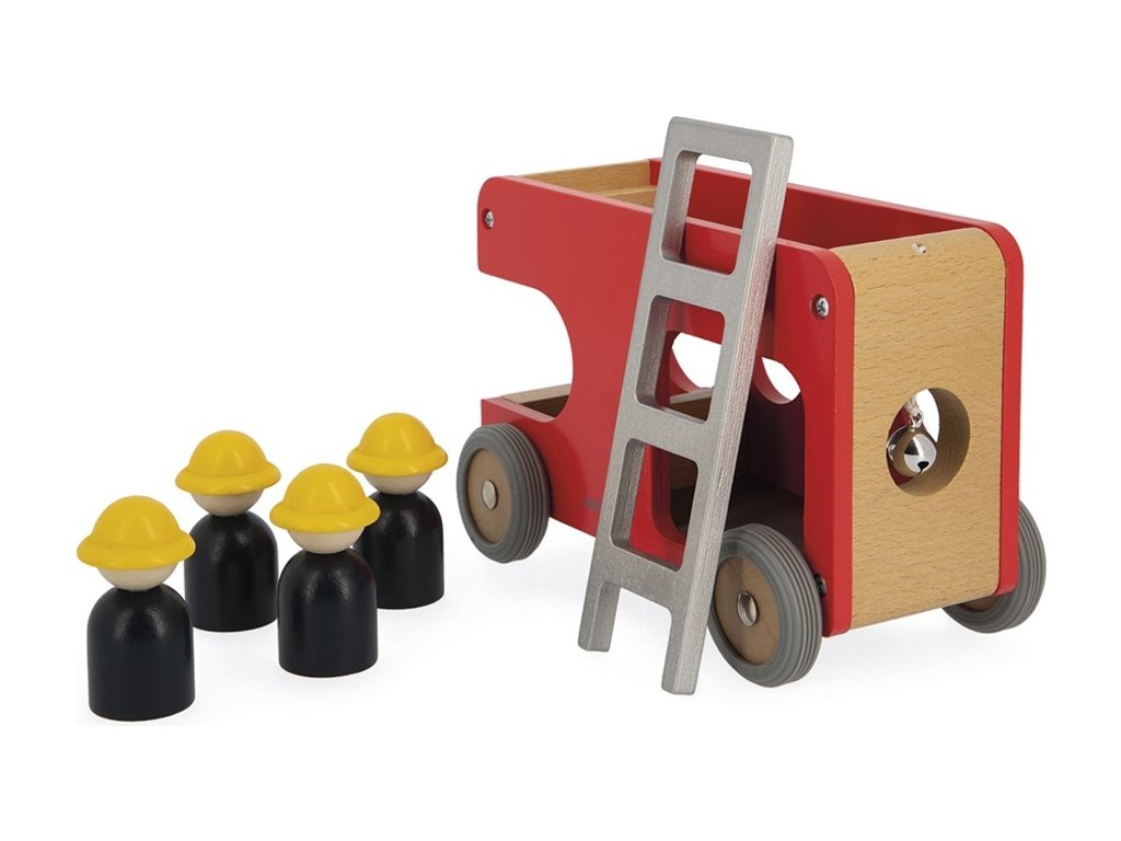 ‚Fiú - fiú - fiú…!!‘ Nagy létra húzódik ki, a tűzoltók kiugranak az autóból, és gyorsan el kell oltaniuk a tüzet! Fejlessze gyermeke fantáziáját ezzel a 4 tűzoltóval és a gyönyörű faautójukkal. Az autó levehető létrával és egy kis csengővel van felszerelve, hogy tudd, közeledik. A kocsinak gumikerekei vannak, amelyek tökéletesen csendesek.