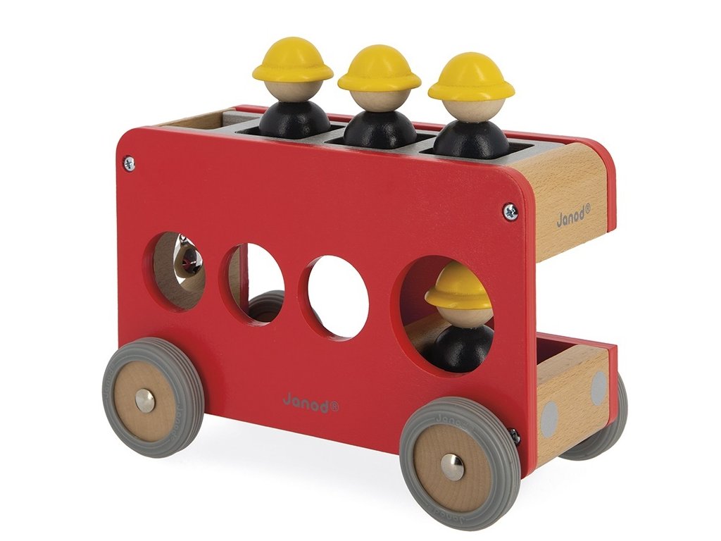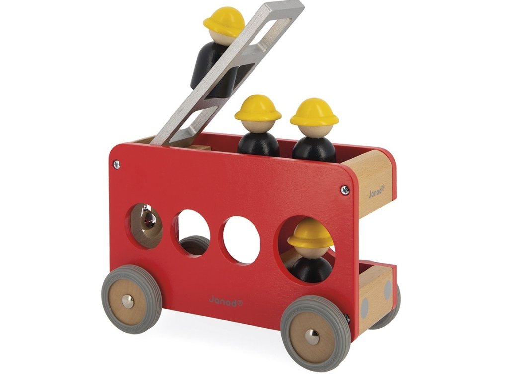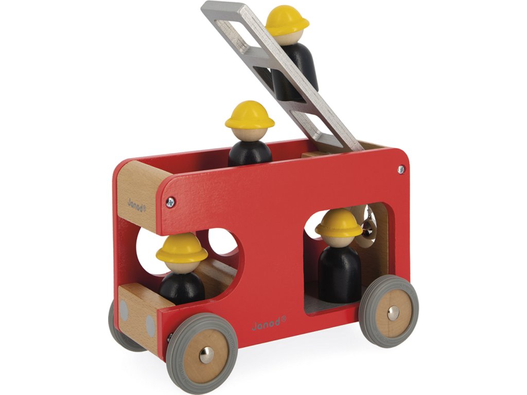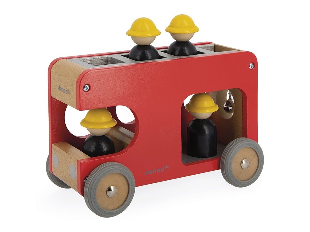 ‚Fiú - fiú - fiú…!!‘ Nagy létra húzódik ki, a tűzoltók kiugranak az autóból, és gyorsan el kell oltaniuk a tüzet! Fejlessze gyermeke fantáziáját ezzel a 4 tűzoltóval és a gyönyörű faautójukkal. Az autó levehető létrával és egy kis csengővel van felszerelve, hogy tudd, közeledik. A kocsinak gumikerekei vannak, amelyek tökéletesen csendesek.