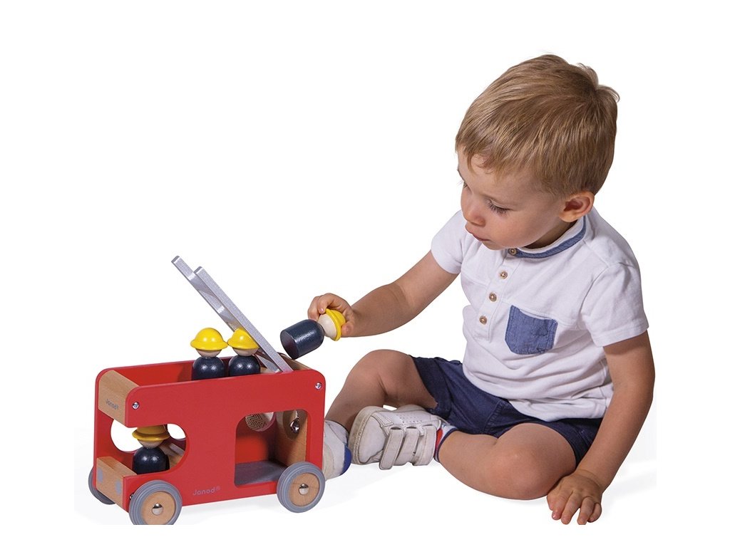 A fa tűzoltóautóval a kicsik rengeteg szórakozást élvezhetnek.