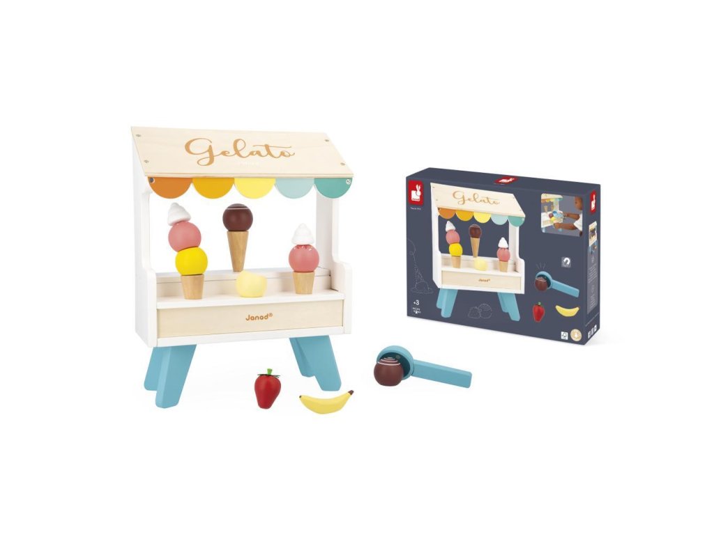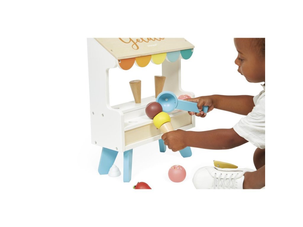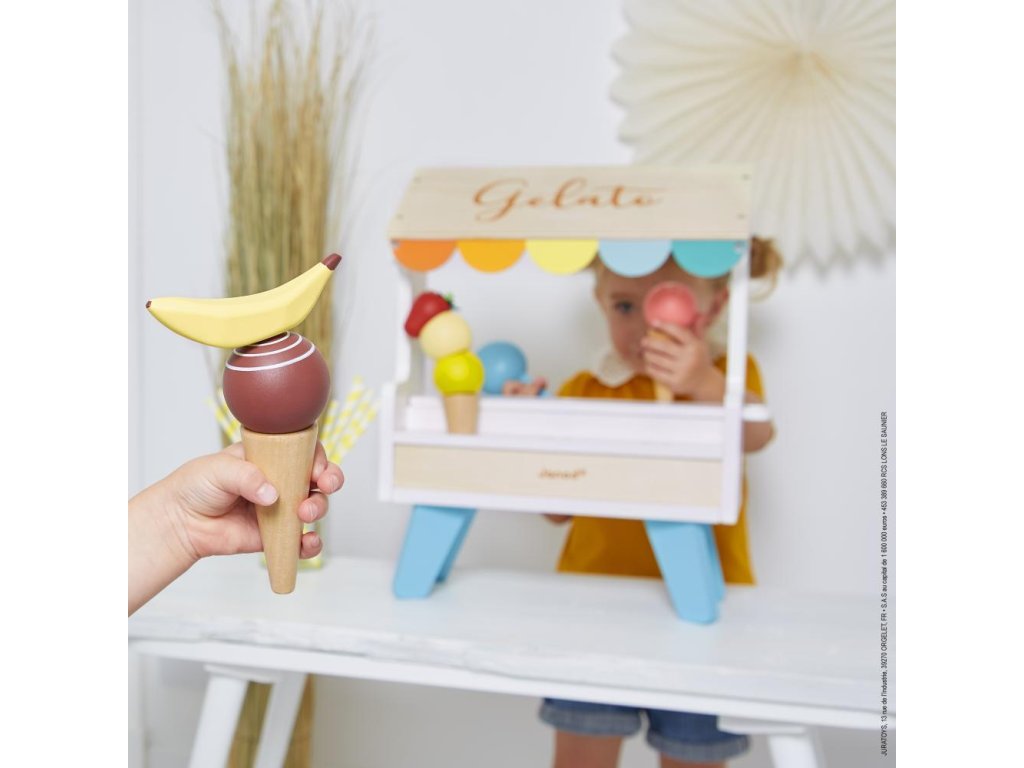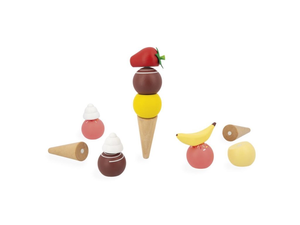 Kér egy tölcsér vanília vagy eper fagylaltot? A fából készült fagylaltos stand szó szerint édes fantázia. Praktikus okokból a fagylaltgombócok, a kanál és egyéb kiegészítők mágnesesek. Így semmi sem esik ki a tölcsérből. Itt mindent megtalál a valódi fagylaltrajongó – 3 tölcsért, egy adagolót, 6 különböző színű fagylaltgombócot, valamint gyümölcsöt és tejszínhabot. Összefut a nyál a szádban?
