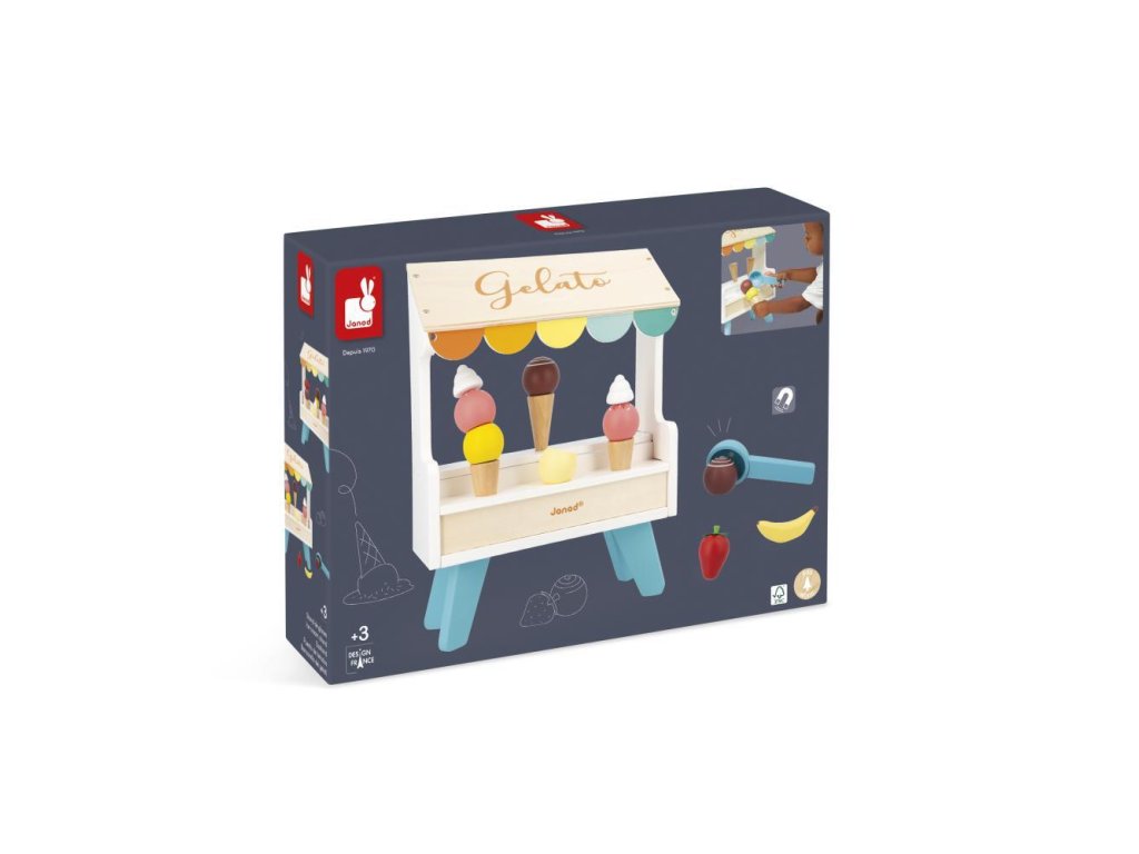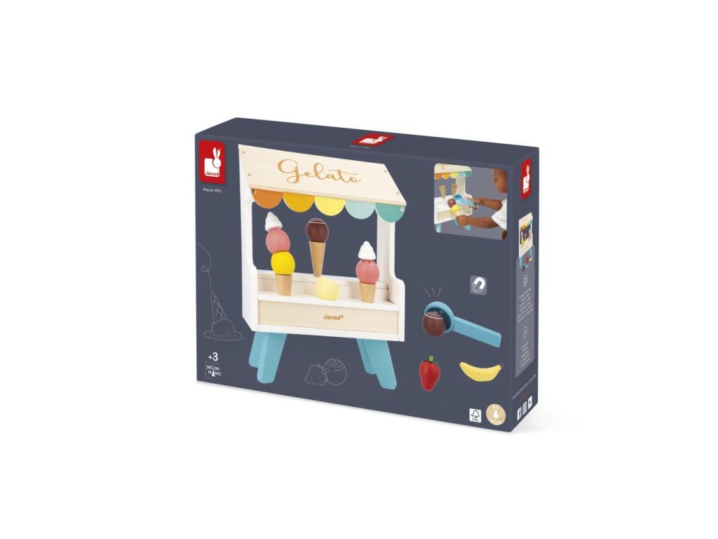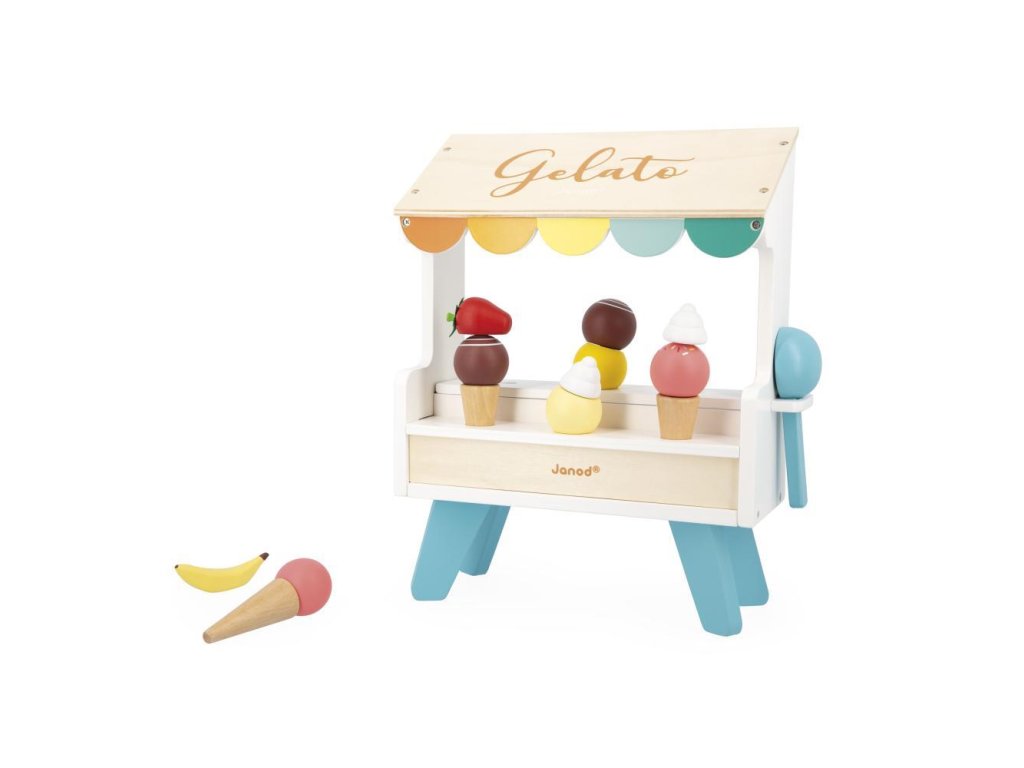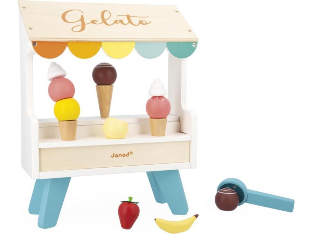 Kér egy tölcsér vanília vagy eper fagylaltot? A fából készült fagylaltos stand szó szerint édes fantázia. Praktikus okokból a fagylaltgombócok, a kanál és egyéb kiegészítők mágnesesek. Így semmi sem esik ki a tölcsérből. Itt mindent megtalál a valódi fagylaltrajongó – 3 tölcsért, egy adagolót, 6 különböző színű fagylaltgombócot, valamint gyümölcsöt és tejszínhabot. Összefut a nyál a szádban?