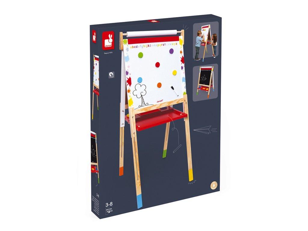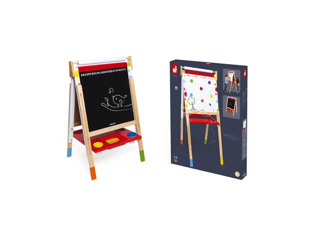 Az egyik oldala egy klasszikus fekete tábla, mint az iskolában, a másik oldala egy mágneses fehér tábla, szép faállványon áll.A táblához számos nagyszerű kiegészítő tartozik, melyek egyértelműen lekötik és szórakoztatják a gyermekeket hosszú időre. A rajzoló kréta csomag a tartozék, így a gyerekek játszhatnak iskolai tanítást, üzletembereket a megbeszélésen, vagy ha kint rossz az idő és nem rajzolhatnak a járdán, akkor ez a tábla biztosan megmenti őket. A tábla krétától való letörléséhez és tisztításához használható a csomagban található szivacs.