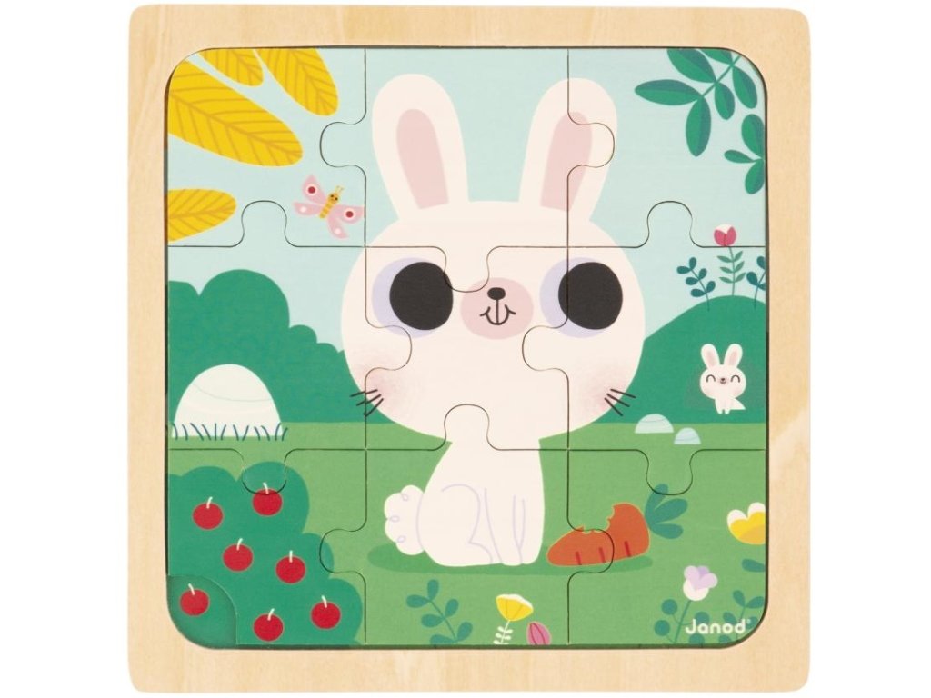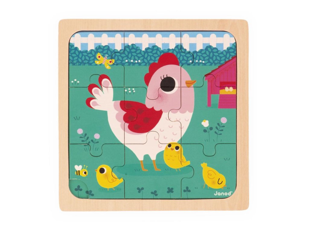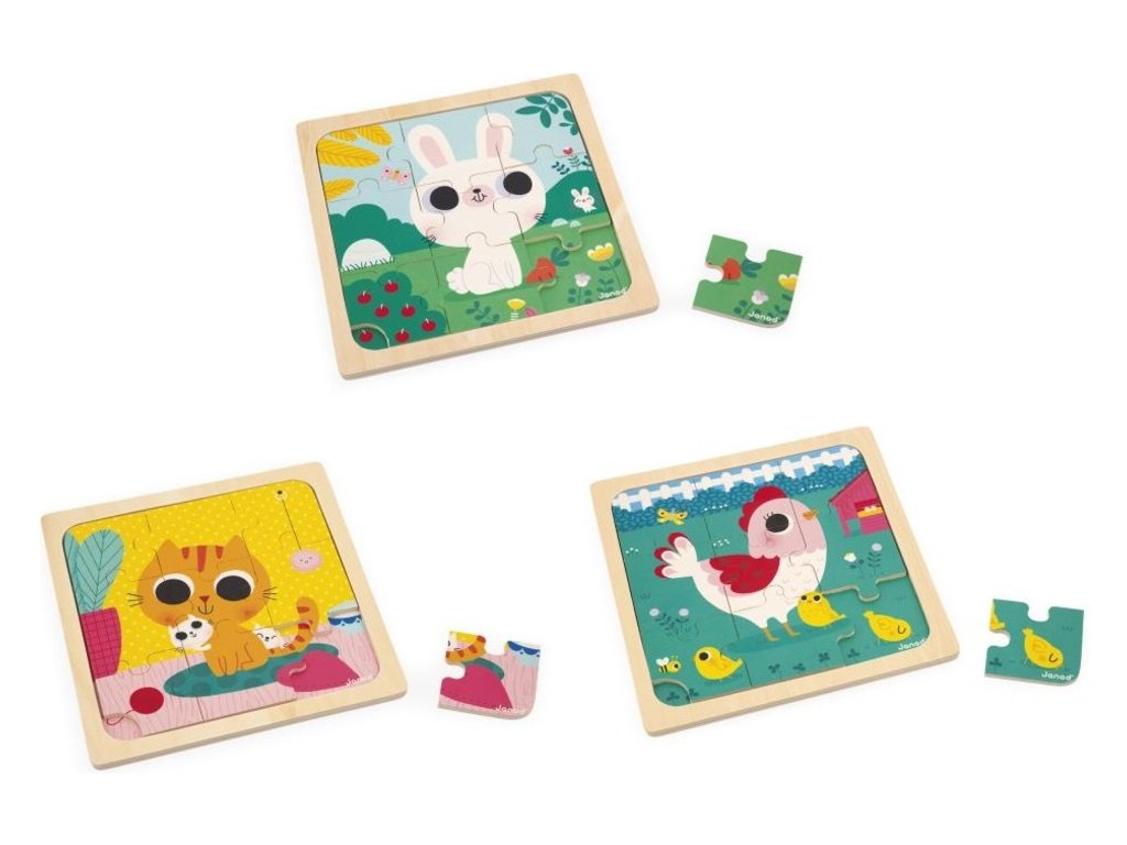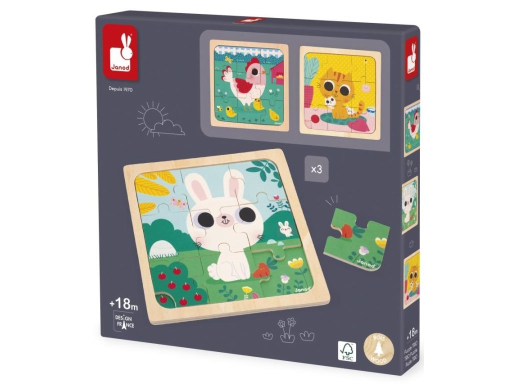 Találd meg Henriettát, Mogyorót és a fehér nyuszit ugyanabban a dobozban! Három kirakósból álló készlet, amely tartalmazza Mogyoró macskát, a répával táplálkozó nyulat és a cuki Henrietta tyúkot.