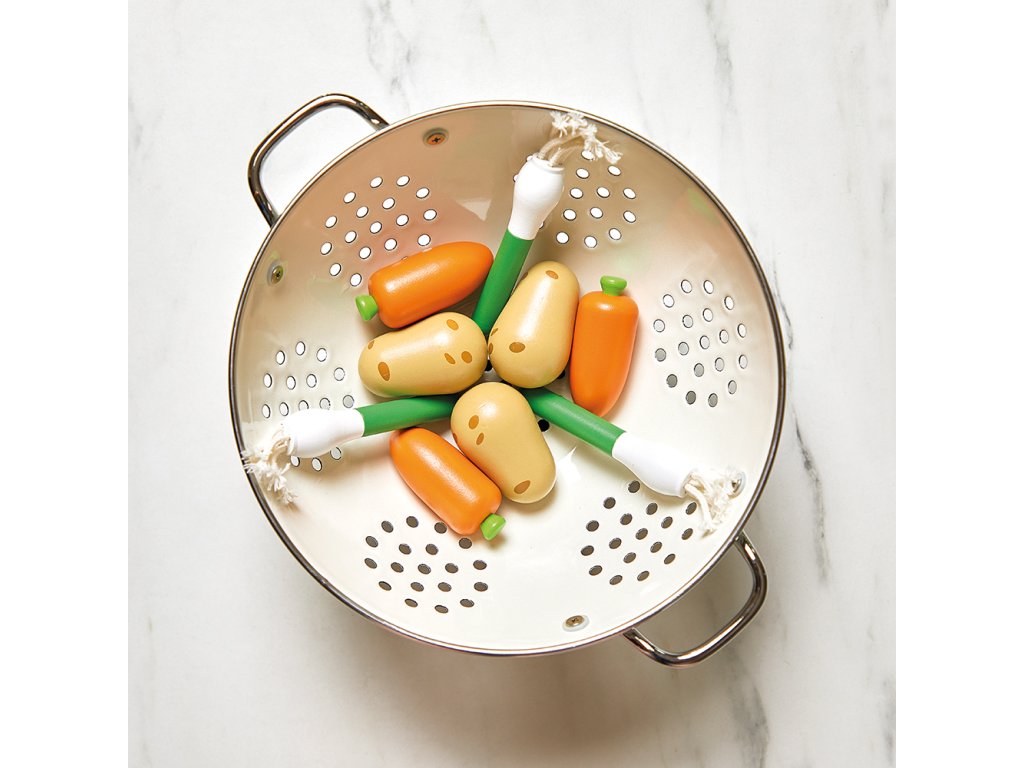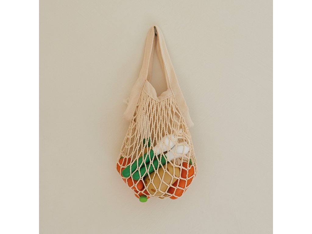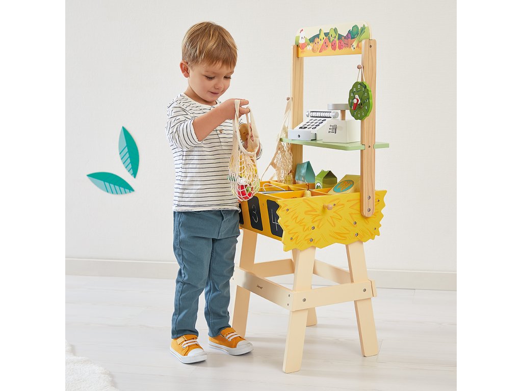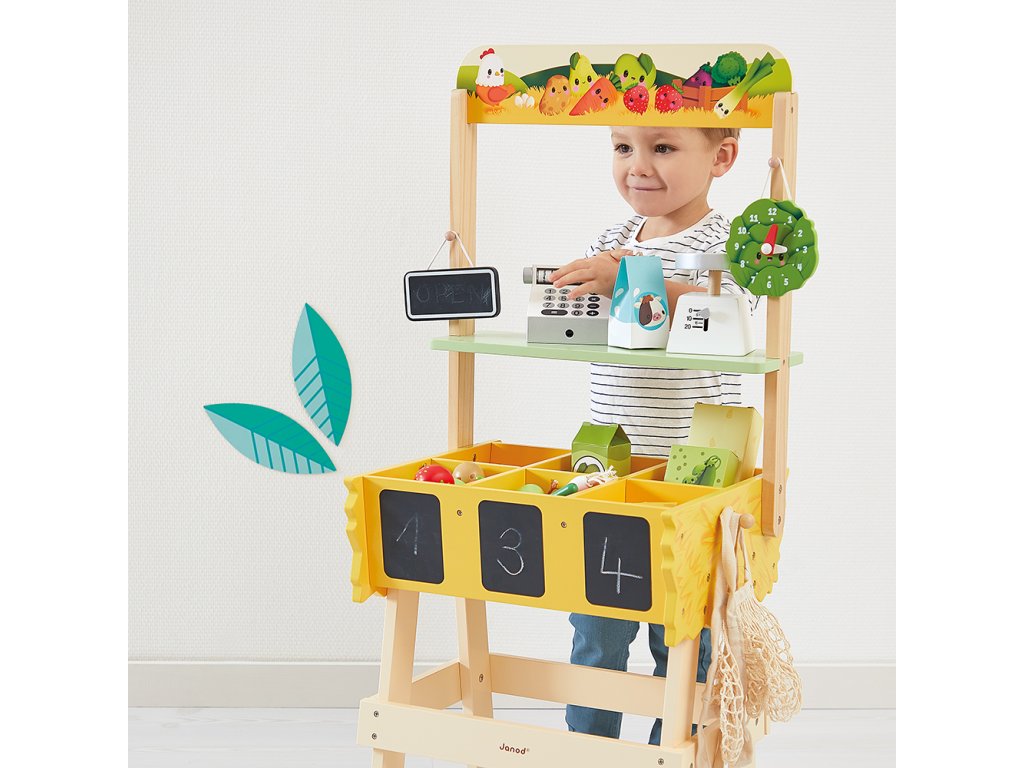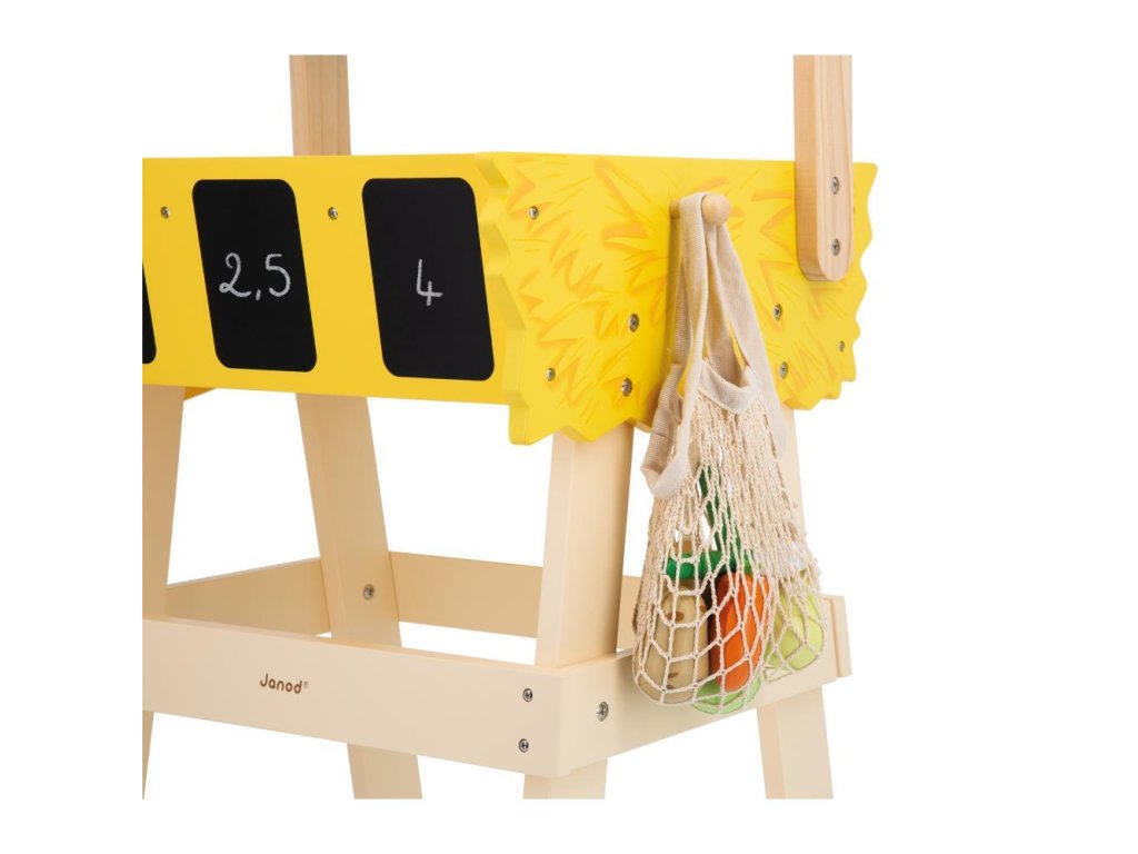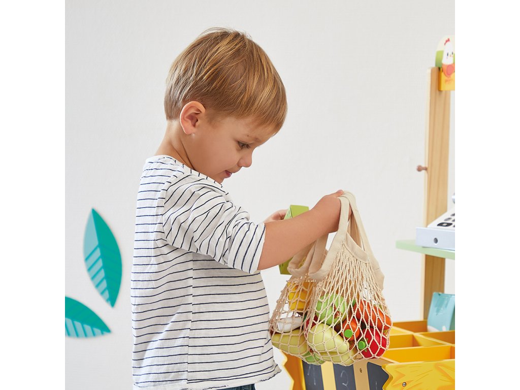 Ahogy a felnőttek, a kicsik is kraft papírba csomagolhatják a zöldségeket, mielőtt átadnák azokat a vásárlóknak. Ezen kívül a csomag 2 hálós bevásárlótáskát is tartalmaz, amelyet azoknak a vásárlóknak adhatnak, akik nagy bevásárlást végeznek: praktikus, újrafelhasználható és nagyon valósághű! Rendkívül praktikus: 3 fa csap tartja a táskákat vagy más piaci kiegészítőket.