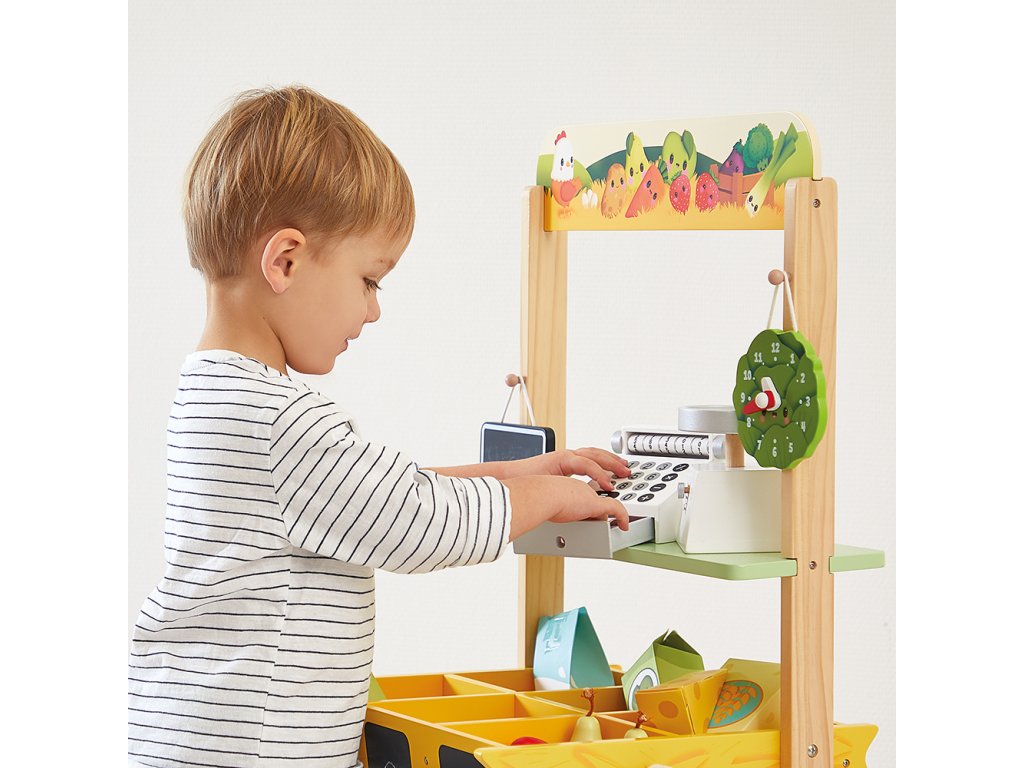 A kistermelők piaca nyitva áll! A fa Farm Market játékunk ideális játék a 3 évesnél idősebb gyermekek számára, akik imádni fogják a saját vállalkozásuk színlelését.