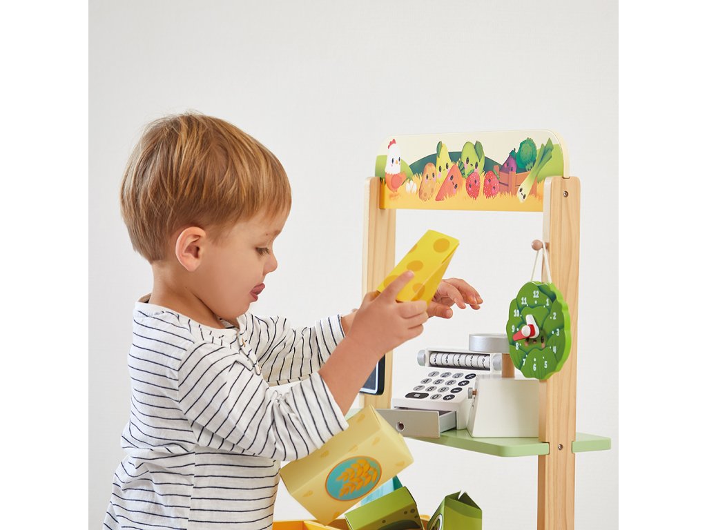 Ez a fából készült játék arra ösztönzi a legkisebbeket, hogy sok történetet találjanak ki és osszanak meg másokkal! Ráadásul mindig érdekes megtanulni, hogyan kell a termékeket a polcra helyezni, vagy hogyan kell kiszámítani az árukat. A kis élelmiszerboltjuknak köszönhetően a kisgyermekek a fantáziájuk és a szókincsük mellett fejleszthetik szociális és kognitív képességeiket is! Ez a játék segít nekik jobban megérteni, hogyan működik a vásárlás és a főzés. A kisgyerekeknek garantáltan sok szórakoztató órájuk lesz, amikor arra várnak, hogy a vásárlók megvásárolják a helyi termékeiket!
