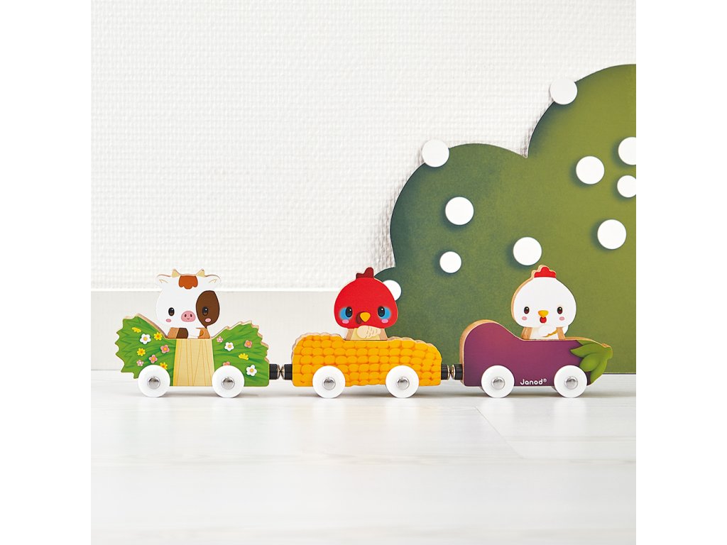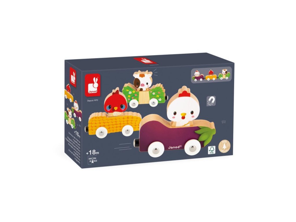 A réten és az istállóban élő állatok imádják a farmon zajló versenyeket! Ez a mágneses játék 3 autóból (padlizsán, kukorica és mezei virágok) és 3 fából készült figurából (csirke, pulyka és tehén) áll.