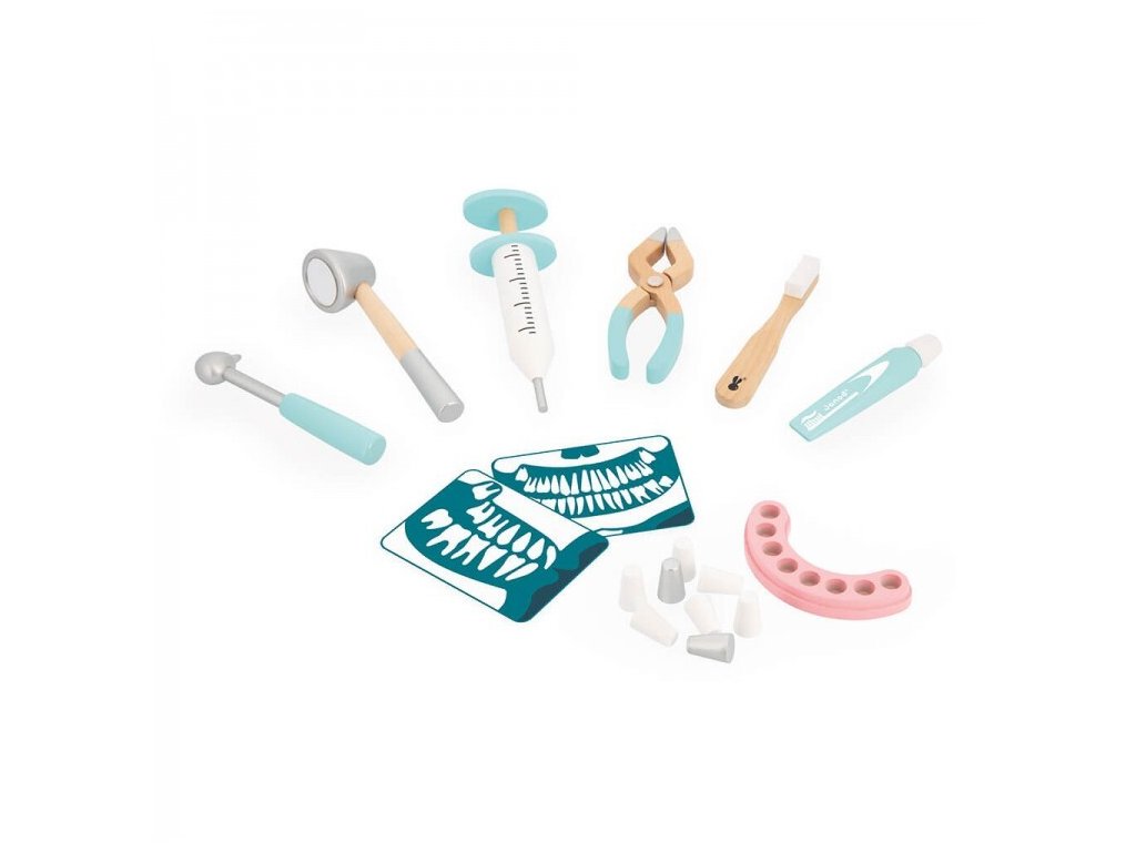 A készlet tartalmaz egy kivehető fogakkal ellátott műfogsort, amelyen a gyerekek gyakorolhatják készségeiket, fogókat a fogak kihúzásához, injekciós fecskendőt, fogfúrót, fogkefét, fogkrémet tubusban és egyéb kiegészítőket.