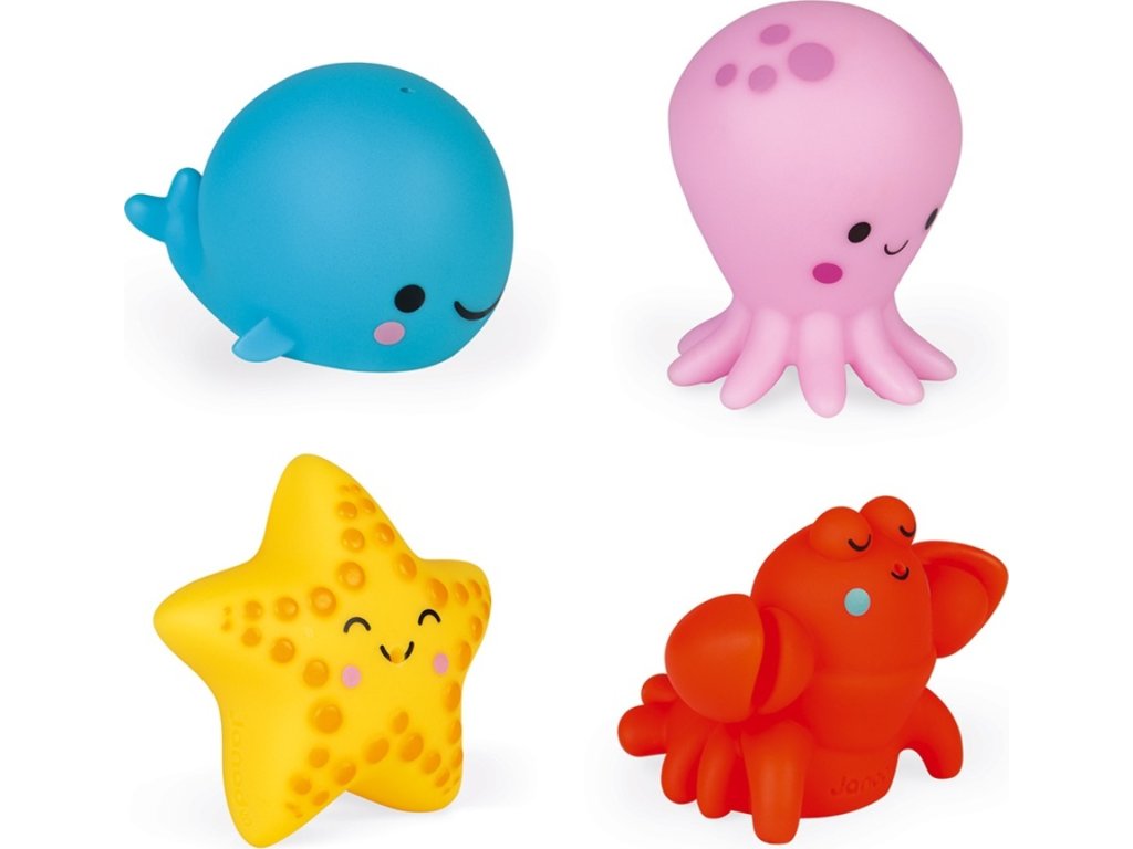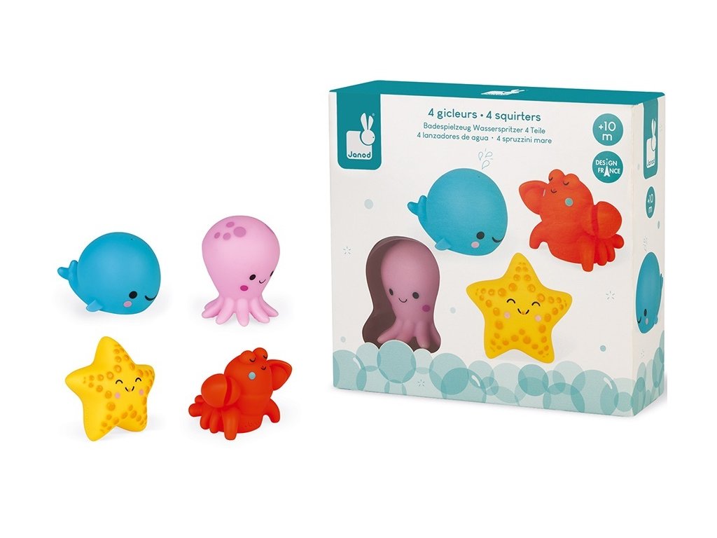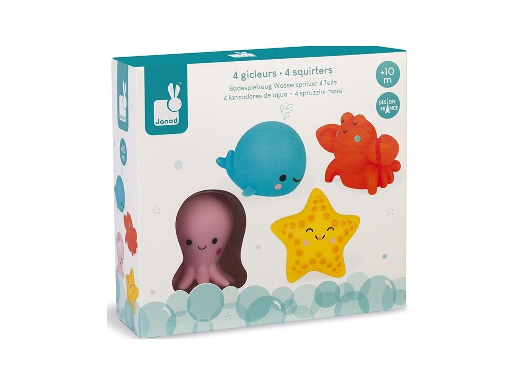Vízbe fecskendező játék Tengeri állatok 4 db Janod Bath toys sorozat.Puha műanyag figurák a legkisebbeknek, a játék alkalmas szárazföldi és vízi játékra egyaránt.