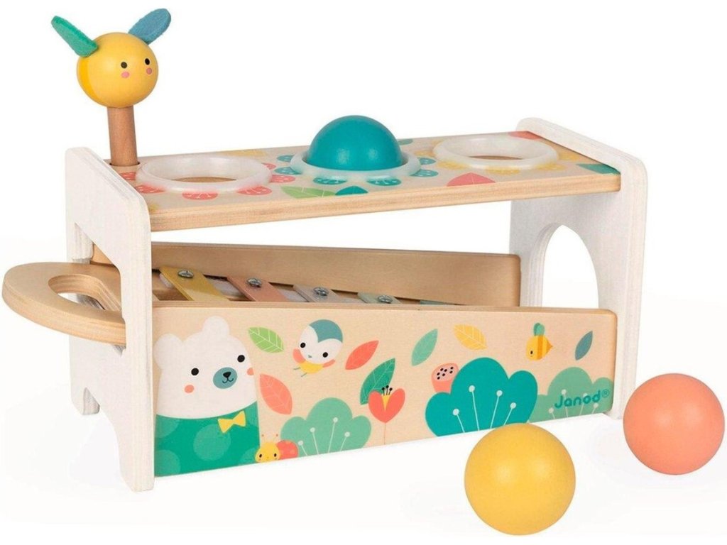 Gyönyörű fa kalapálós játék és xilofon egyben a készségek fejlesztésére nagyon finom és modern színekben, aranyos fa állatokkal. A játék segít gyermekének fejleszteni a kézügyességet, és sok szórakozást is nyújt vele. Két játék egyben - a méhecskés kalapáccsal 3 fa színes golyót ütünk be, amelyek gyönyörű csengő hangot adnak a xilofon billentyűin, és a játék része maga a levehető xilofon is, így gyermeke bárhol játszhat!A játék 12 hónapos kortól alkalmas gyermekek számára.Méret: 29,1 x 12 x 13 cm