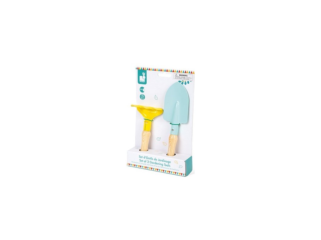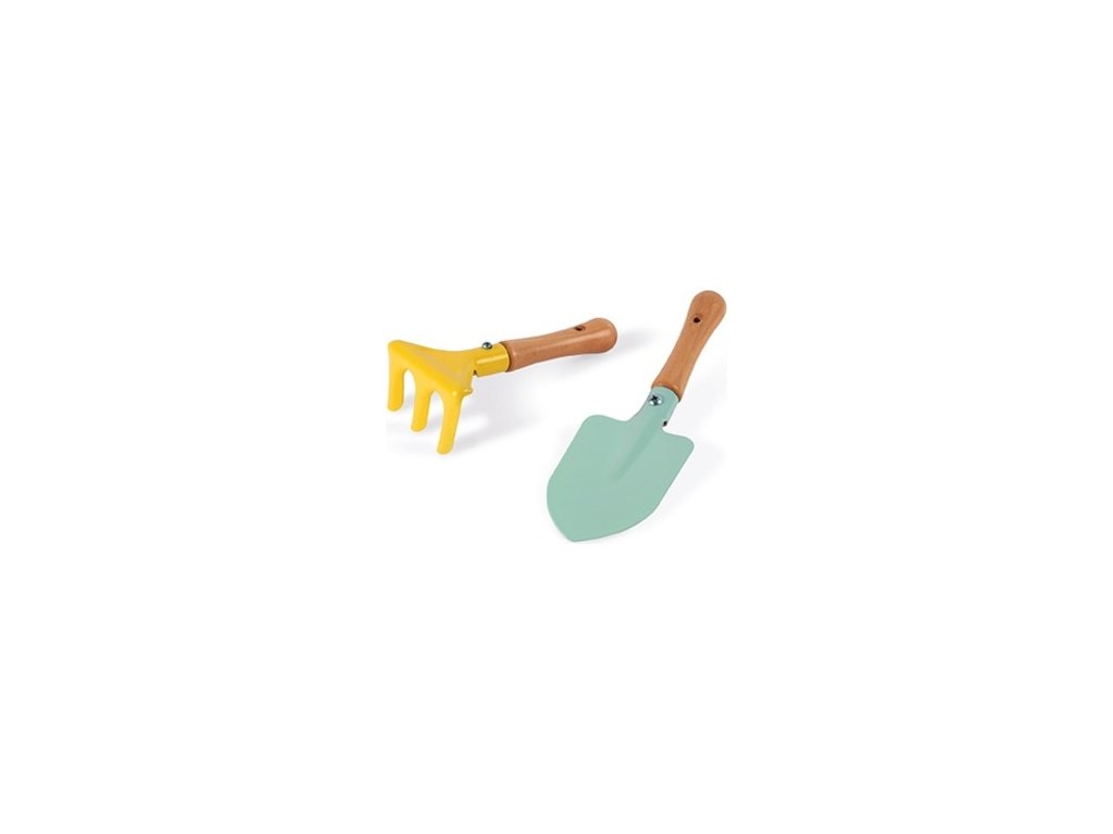 A színek pasztell árnyalatokban harmonizálnak.A gereblye és az ásó masszív fa nyéllel rendelkezik.