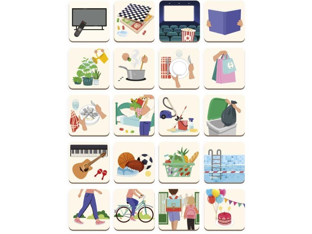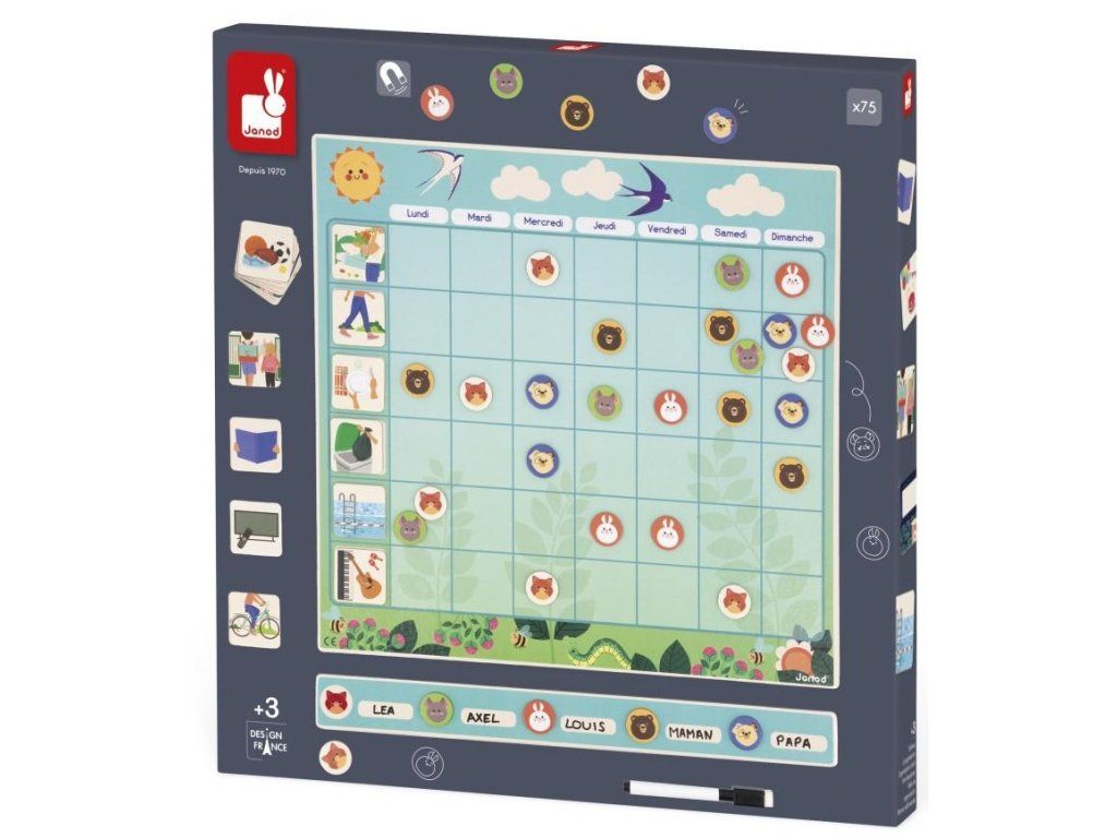 Minden napra és tevékenységre van egy négyzet kijelölve, amelybe gyermeke egy állatmágnest helyez, amely a család azon tagját vagy tagjait képviseli, akik részt vesznek ebben a tevékenységben. A készlet 5 állatot tartalmaz, amelyekből 11 másolat van, 7 matrica 6 nyelven a hét napjaira és 20 mágnes tevékenységekhez az egyszerű házimunkáktól a szabadidős tevékenységekig, beleértve a sportot, a zenét és a születésnapokat, nem beszélve az iskola befejezéséről.