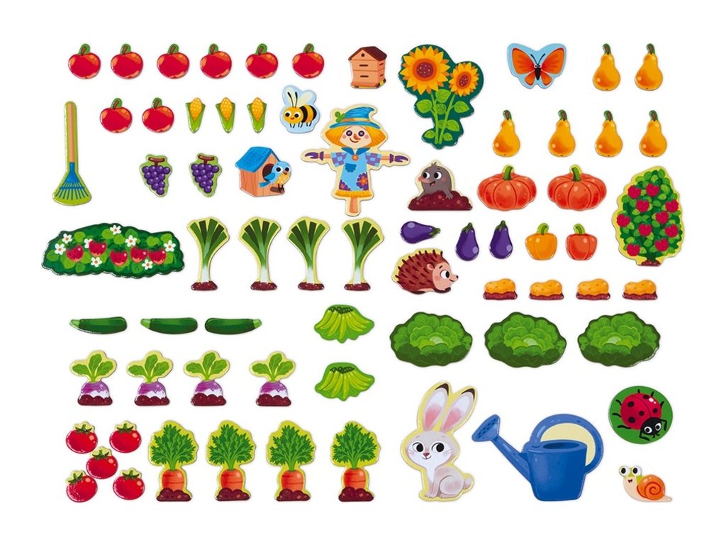 A csomagban állatos mágneseket is találsz, amelyekkel a gyerekek szintén játszhatnak és megtanulhatják, hogy melyik állat mit szeret a legjobban enni a kertből.