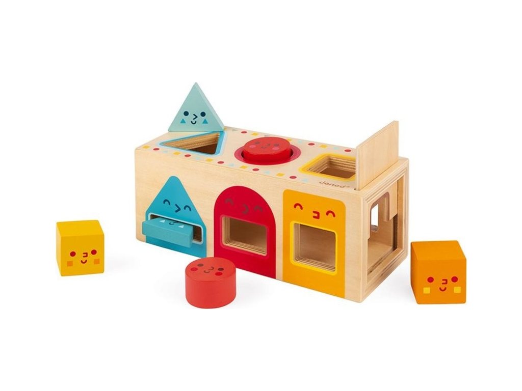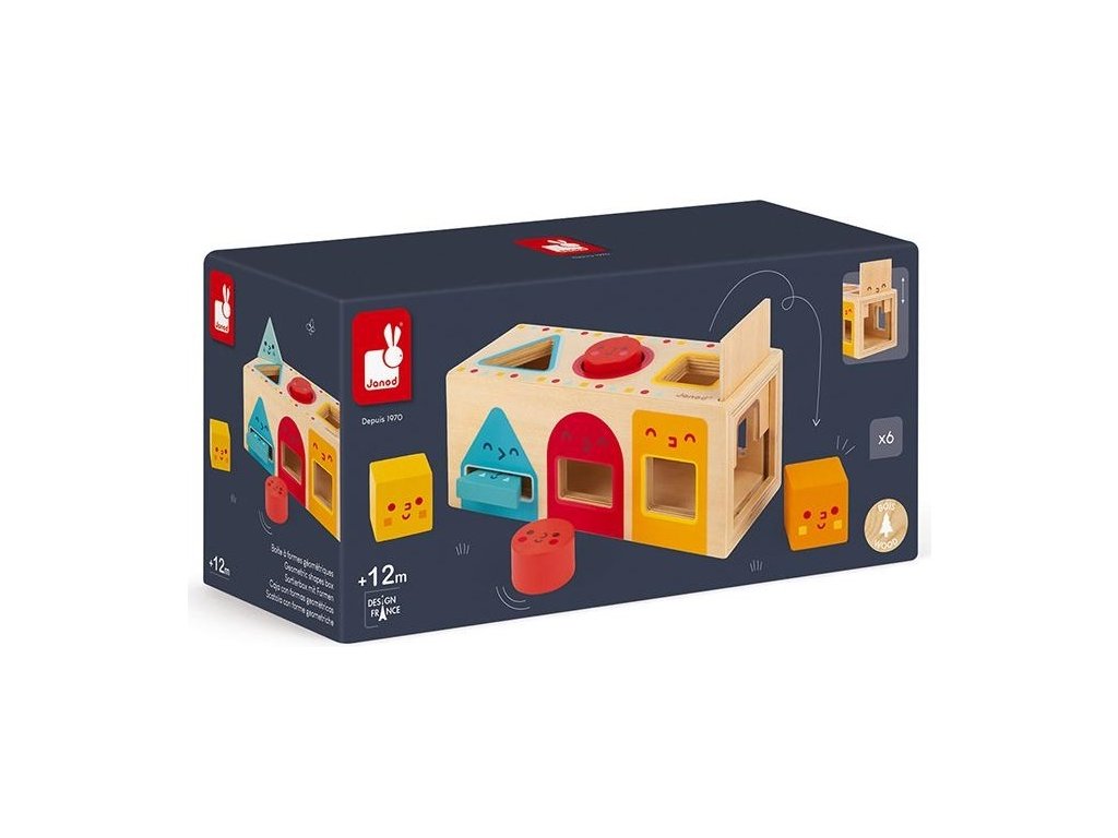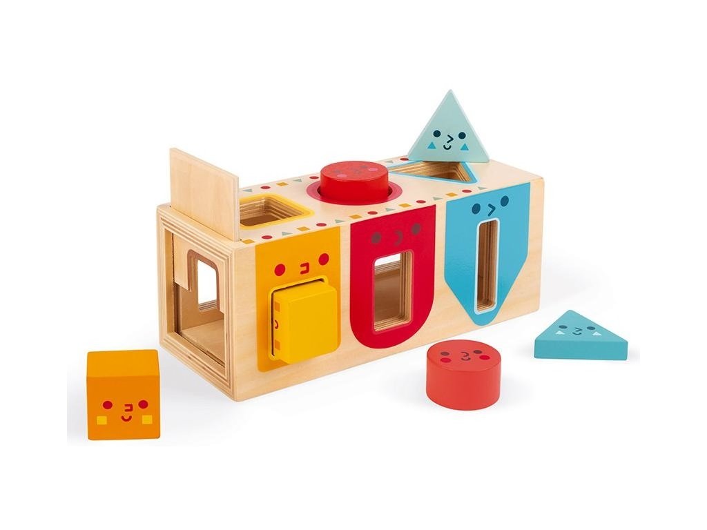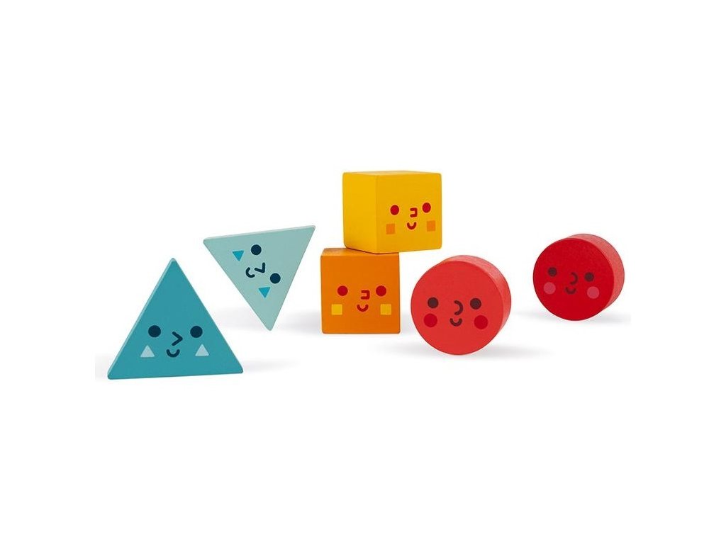 A doboz 6 színes formát tartalmaz - 2 háromszöget, 2 kört, 2 négyzetet. A doboz egyik oldalán van egy kis csúszó fedél, így a formák könnyen eltávolíthatók.