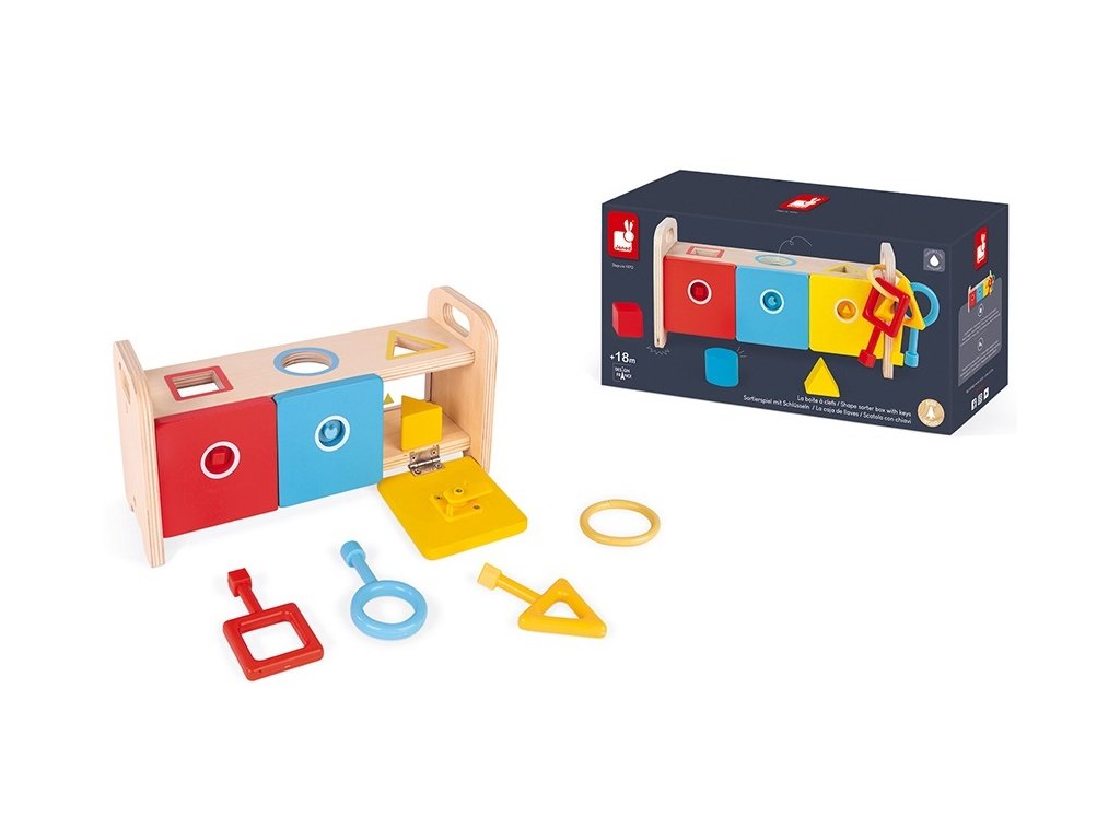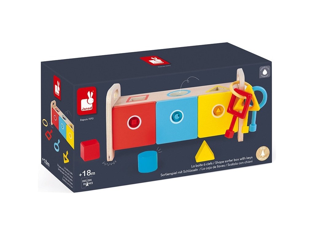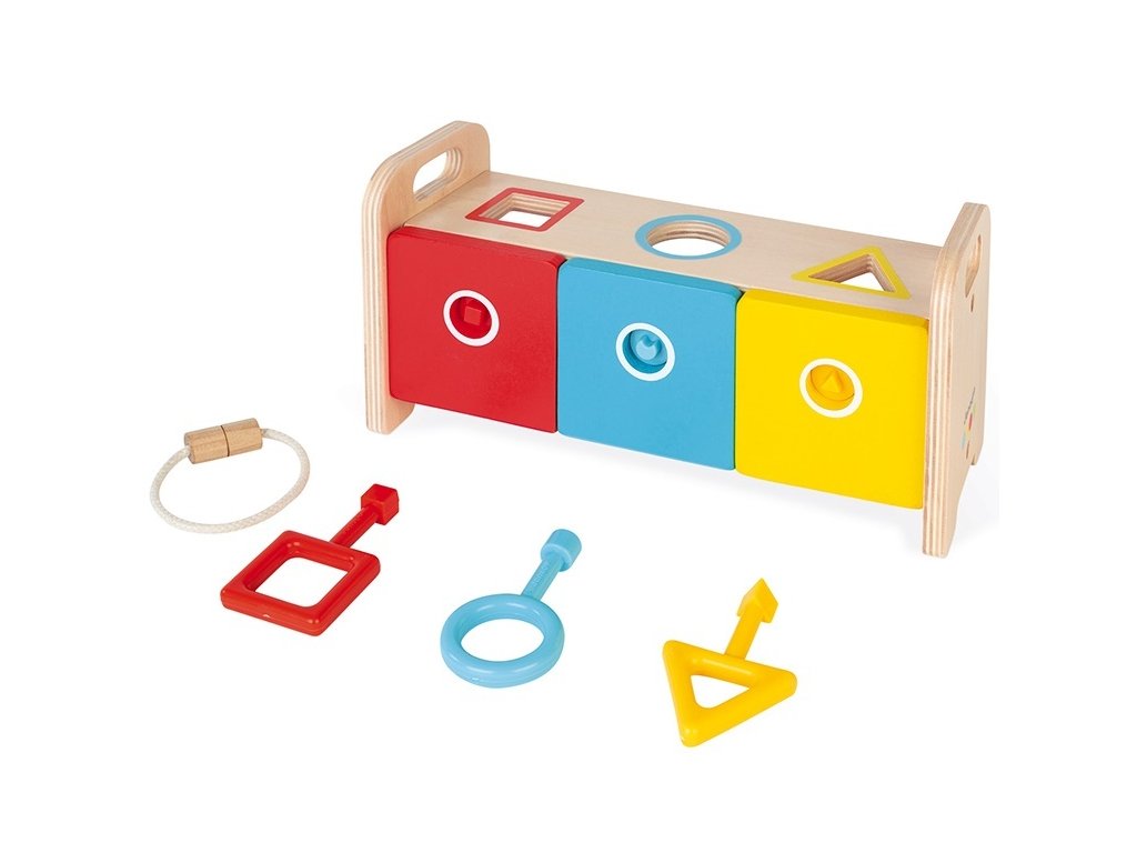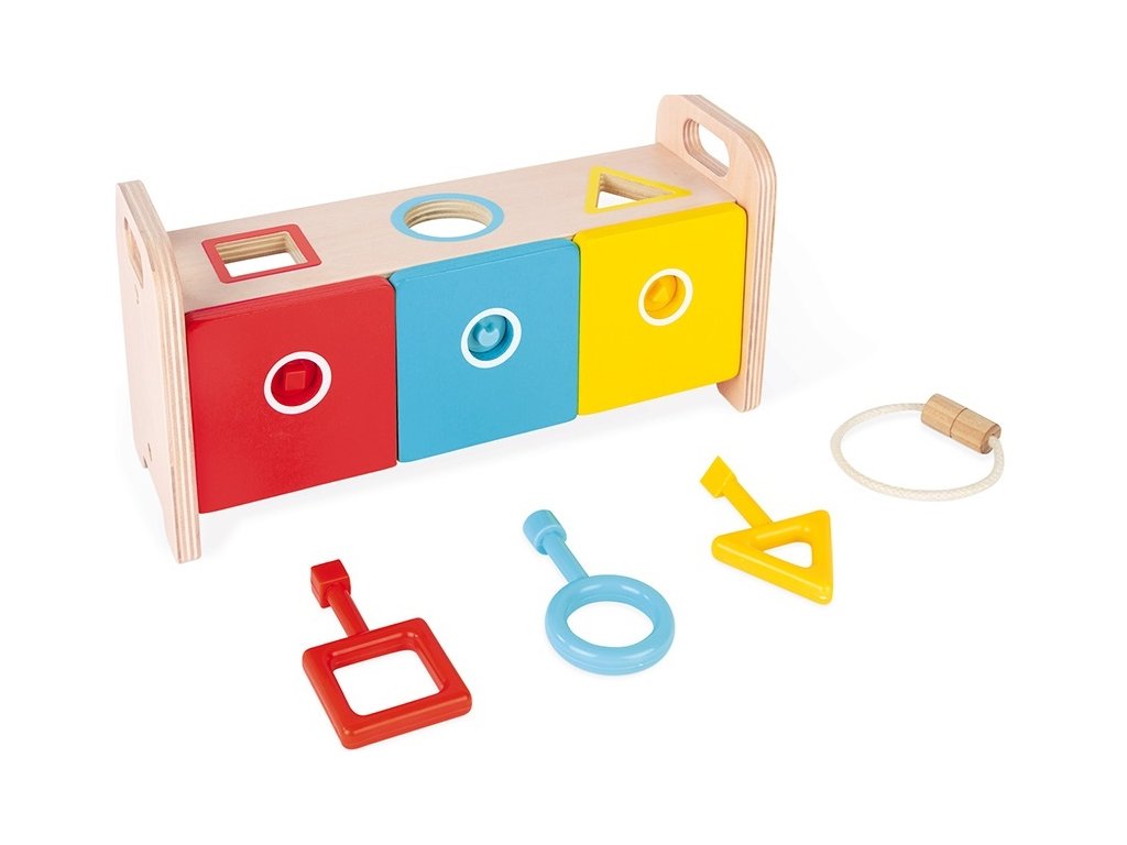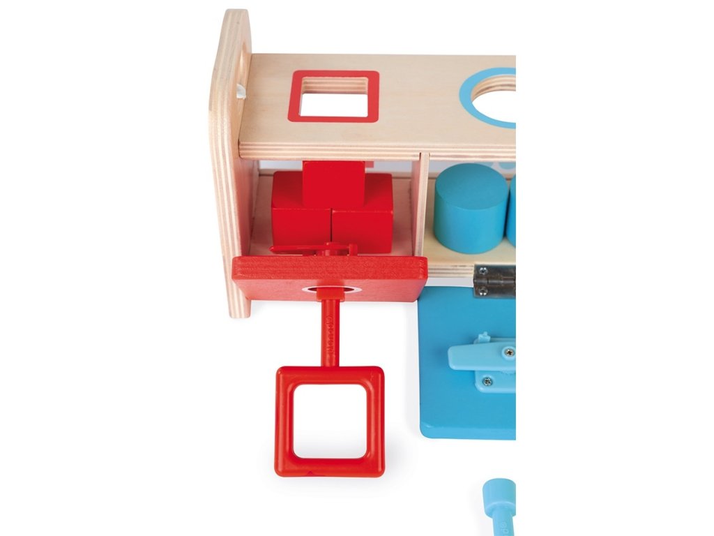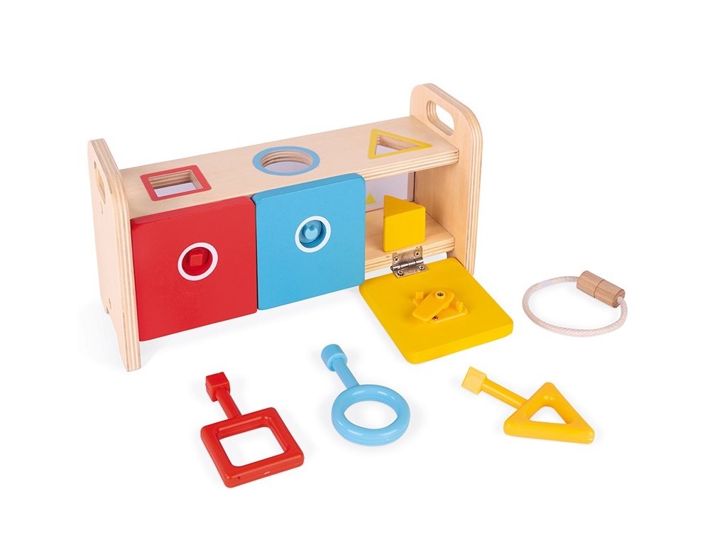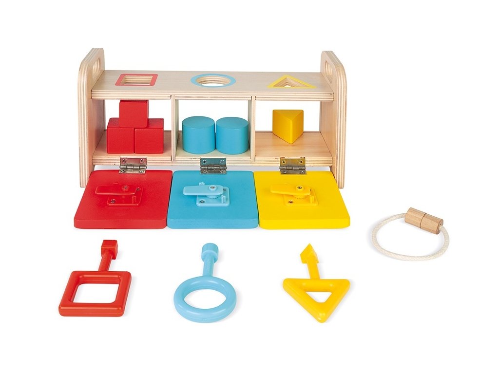 Fa játék beillesztéshez és válogatáshoz kulcsokkal és zárakkal Janod Montessori Learning Toys sorozat.