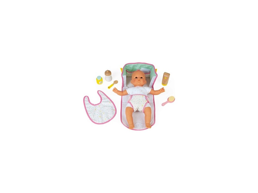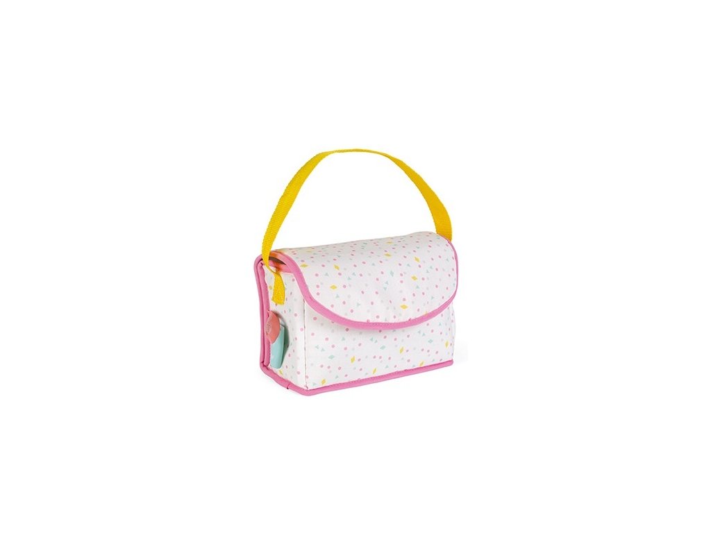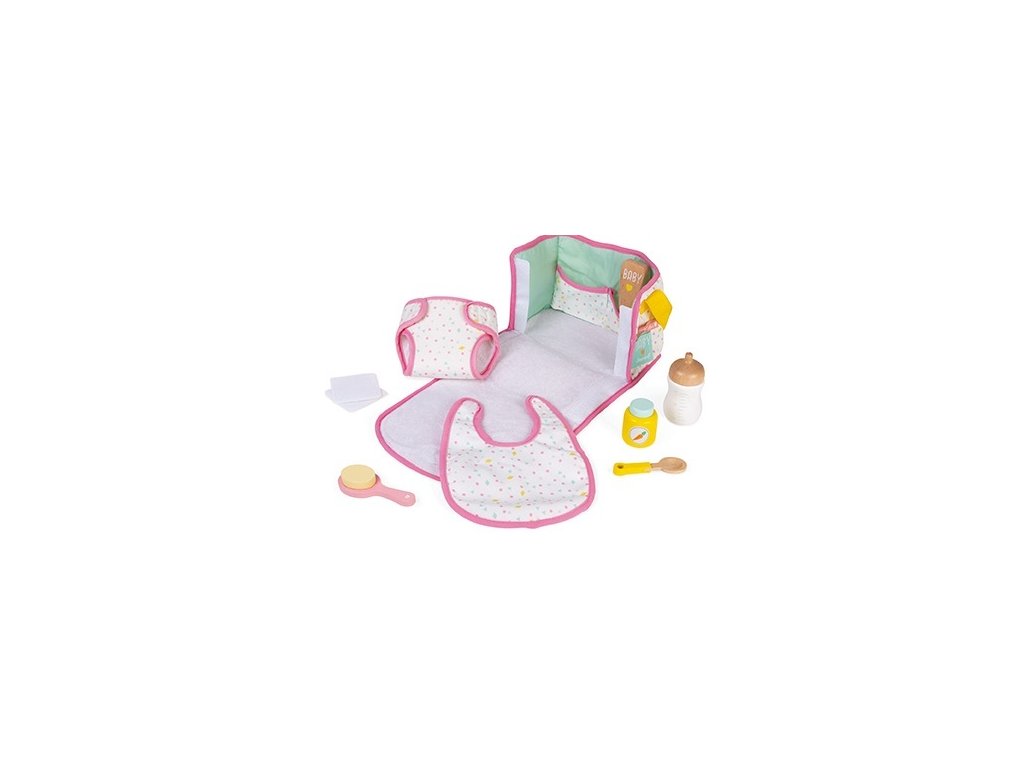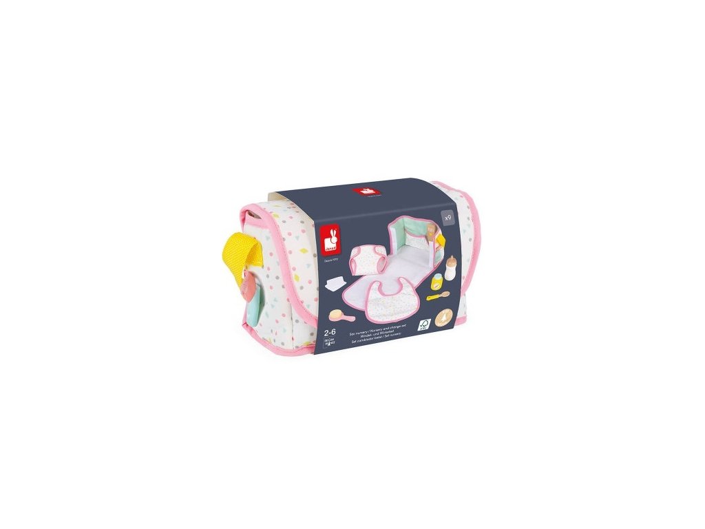 Szép szövet pelenkatáska, amely mindent tartalmaz, amire gyermekének szüksége van ahhoz, hogy gondoskodhasson a babájáról: 1 előke, 1 pelenka, 1 kanál, 1 kefe, 1 kis tál, 1 tubus krém, 1 üveg és 2 pamut pelenka.