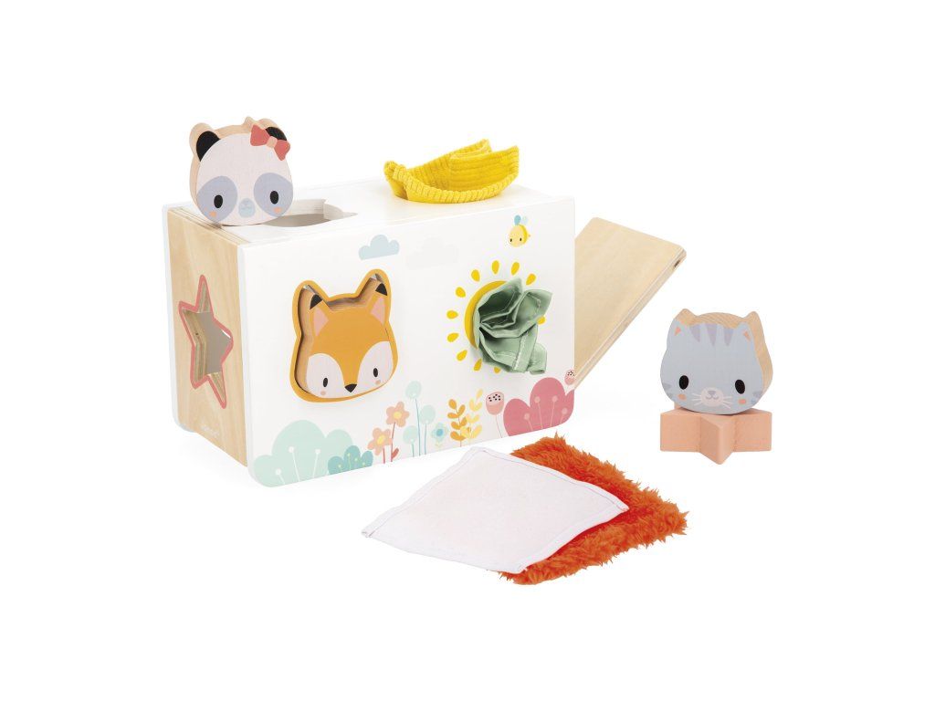 Fedezze fel a formákat és textúrákat ezzel a kedves zsebkendő tartóval a Janod PURE sorozatból. 4 fából készült elemet tartalmaz: 3 állatfejet (1 panda, 1 macska, 1 róka) és egy csillagot, valamint 4 különböző textúrájú anyag zsebkendőt. Az oldalsó ajtók kinyithatók az elemek egyszerű kivételéhez. Bónuszként gyermeke minden fej mögött egy szórakoztató tükröt fedez fel. Fejleszti a finommotorikát. FSCTM fa játék. Játék korai oktatáshoz 12 hónapos kortól.